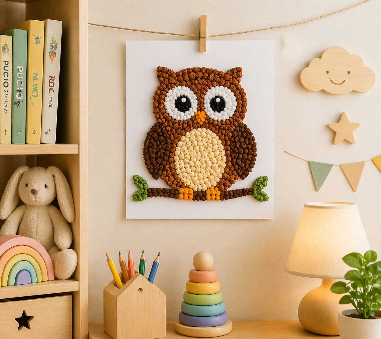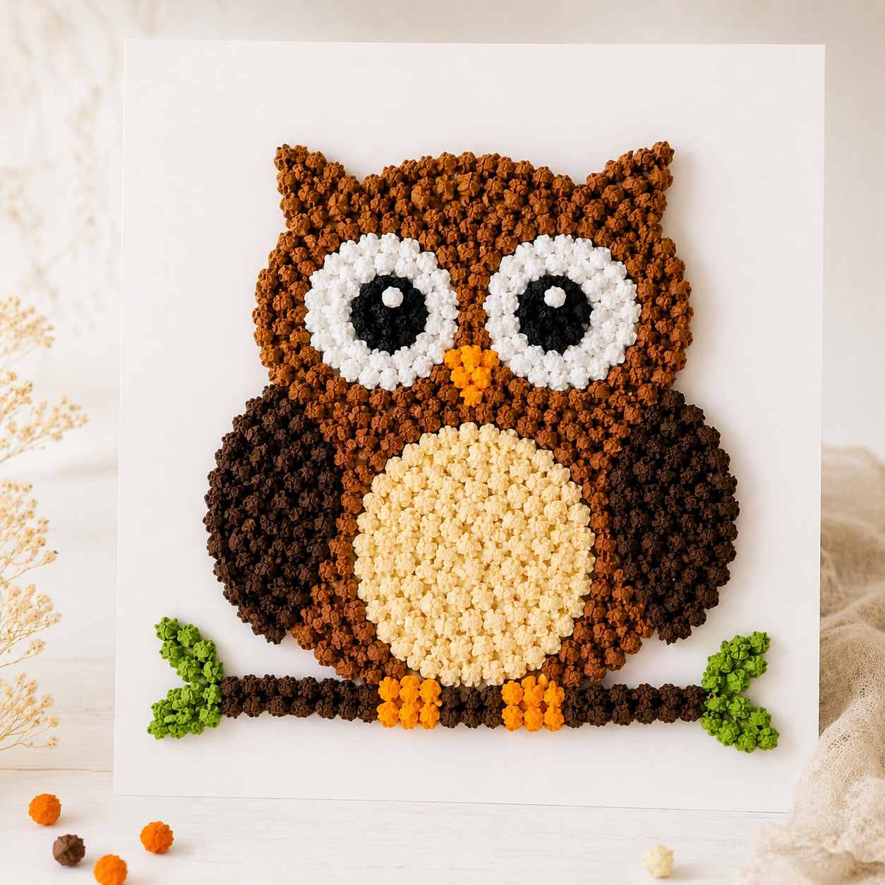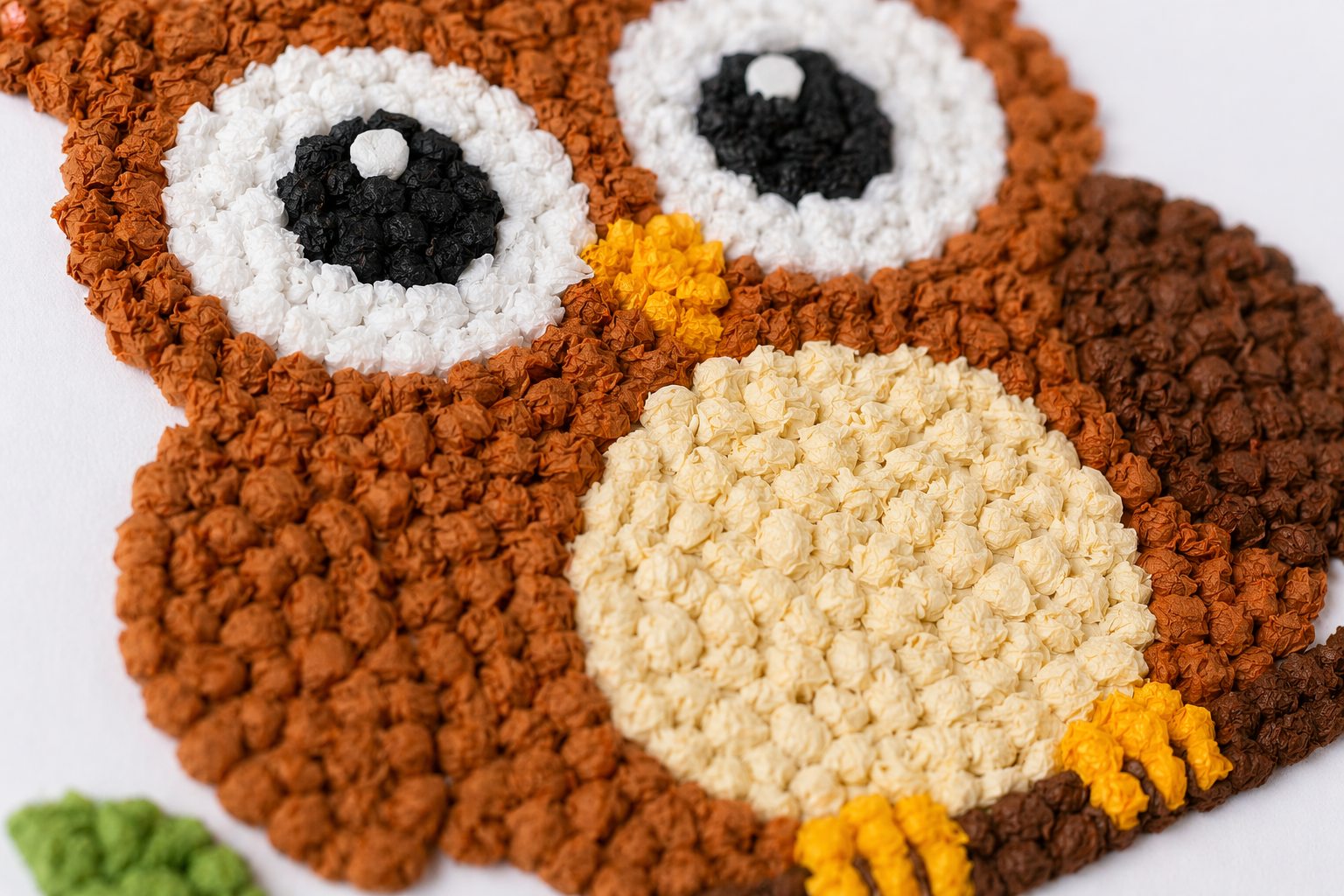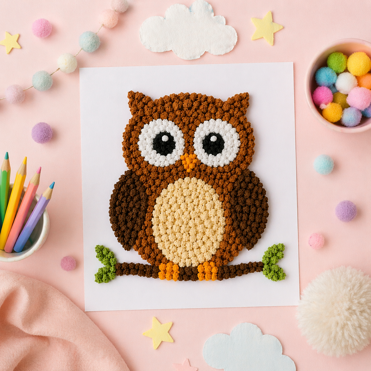 Wyklejanie sowy kulkami z bibuły lub plasteliny to świetny sposób na ćwiczenie małych rączek i rozwijanie koncentracji 💡