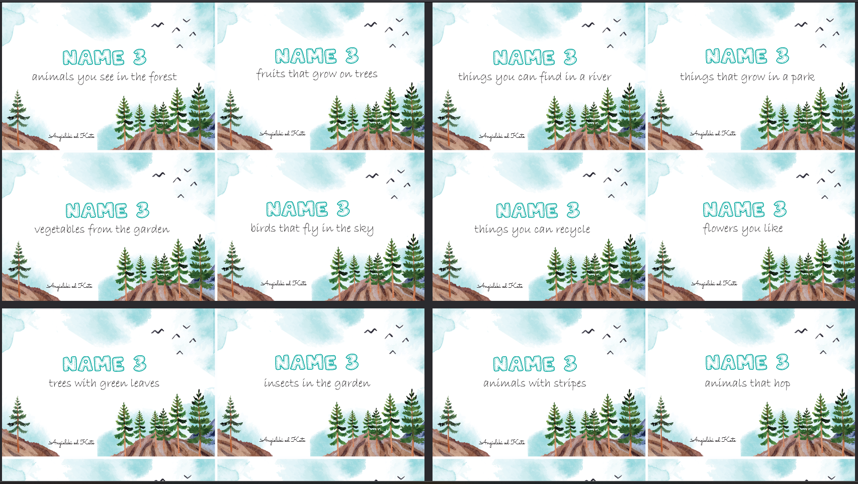 Nature (Świat Przyrody) gra Name 3 /56 kart zawiera 56 kart do ćwiczenia mówienia na lekcji języka angielkiego w miły i zabawny sposób o tematyce natury. Zawiera również tło. Zagadnienia od A1- B2. Zapraszam!