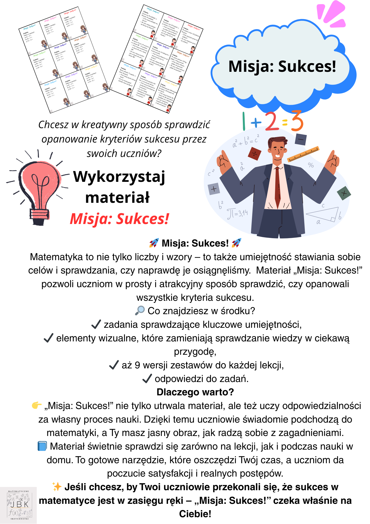 🚀 Misja: Sukces! 🚀 Matematyka to nie tylko liczby i wzory – to także umiejętność stawiania sobie celów i sprawdzania, czy naprawdę je osiągnęliśmy. Dlatego przygotowałam materiał „Misja: Sukces!”, który pozwoli uczniom w prosty i atrakcyjny sposób sprawdzić, czy opanowali wszystkie kryteria sukcesu. 🔎 Co znajdziesz w środku? ✔️ zadania sprawdzające kluczowe umiejętności, ✔️ elementy wizualne, które zamieniają sprawdzanie wiedzy w ciekawą przygodę, ✔️ aż 9 wersji zestawów do każdej lekcji, ✔️ odpowiedzi do zadań. Dlaczego warto? 👉 „Misja: Sukces!” nie tylko utrwala materiał, ale też uczy odpowiedzialności za własny proces nauki. Dzięki temu uczniowie świadomie podchodzą do matematyki, a Ty masz jasny obraz, jak radzą sobie z zagadnieniami. 📘 Materiał świetnie sprawdzi się zarówno na lekcji, jak i podczas nauki w domu. To gotowe narzędzie, które oszczędzi Twój czas, a uczniom da poczucie satysfakcji i realnych postępów. ✨ Jeśli chcesz, by Twoi uczniowie przekonali się, że sukces w matematyce jest w zasięgu ręki – „Misja: Sukces!” czeka właśnie na Ciebie! Materiał zawiera zadania dopasowane do piątego działu w klasie IV do podręcznika z wydawnictwa Nowa Era. Masz pytania? Może sugestie albo propozycje? Napisz do mnie tutaj https://www.facebook.com/matematycznofizycznesketchnotki jkbmatematycznesketchnotki@gmail.com Zauważyłaś/eś błąd w materiale? Napisz mi o tym, ja chętnie go poprawię. "Tylko ten nie popełnia błędów, kto nic nie robi." W ramach podziękowania, prześlę Ci darmowy materiał edukacyjny!