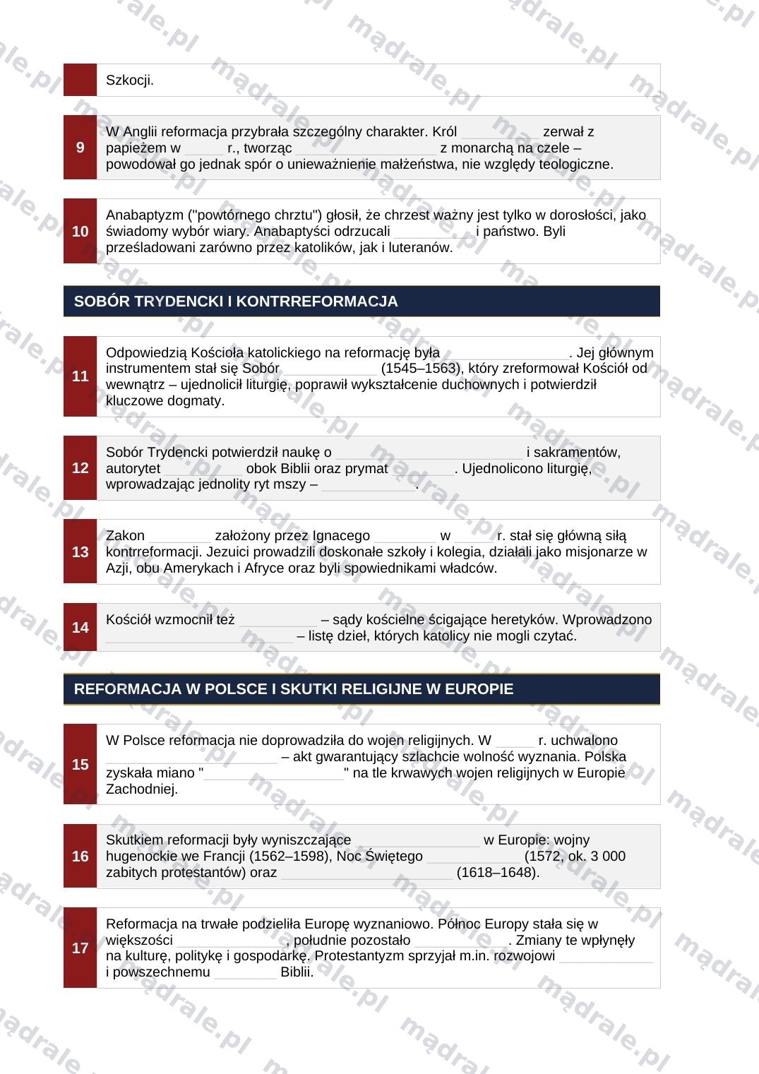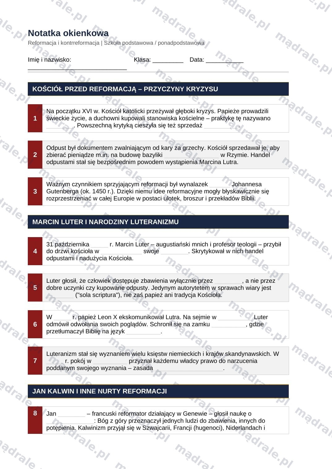 🧩 Notatkę okienkową dotyczącą reformacji i kontrreformacji (m.in. przyczyny rozłamu w Kościele, główne założenia reform, działania Kościoła katolickiego).