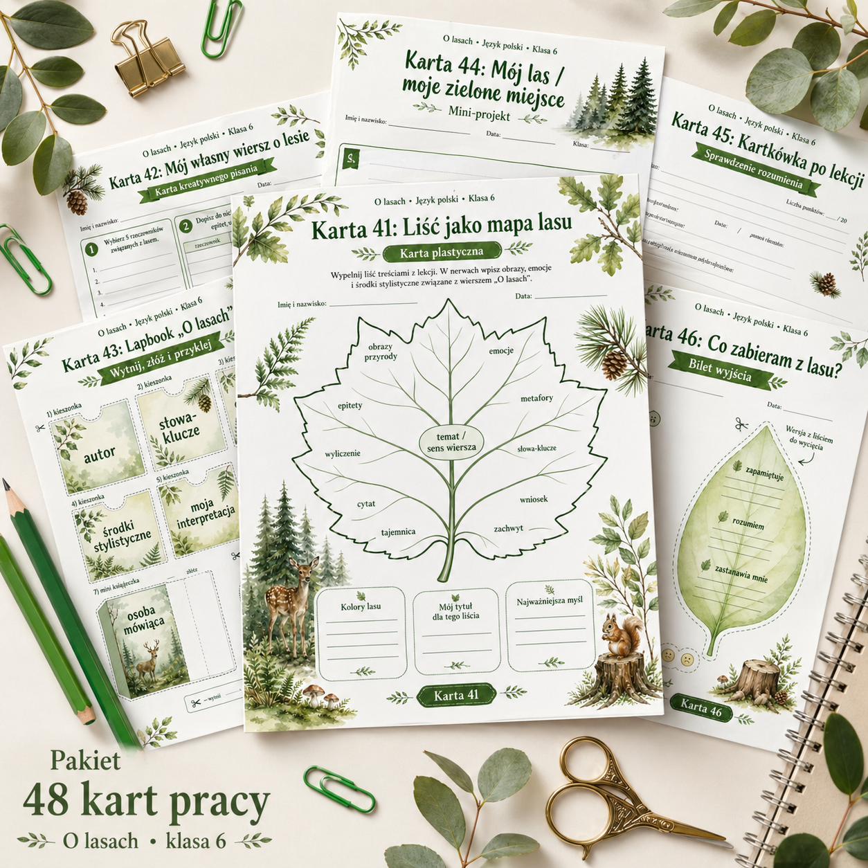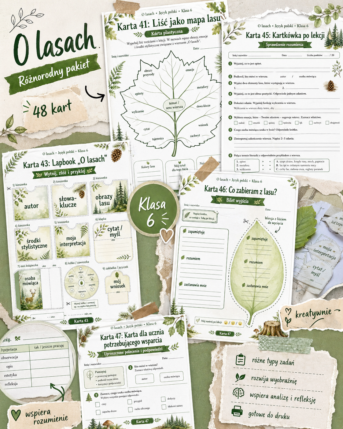 Pakiet prowadzi uczniów krok po kroku: od pierwszych skojarzeń z lasem, przez analizę osoby mówiącej, epitetów, obrazów poetyckich i słów-kluczy, aż po interpretację zakończenia, refleksję duchową, ekologiczną i etyczną. Znajdziesz tu zarówno klasyczne karty pracy, jak i wklejki do zeszytu, sketchnotki, lapbook, stacje zadaniowe, escape room, grę dydaktyczną, memory, kartkówkę, bilet wyjścia oraz karty dostosowane do różnych potrzeb uczniów. 🍃