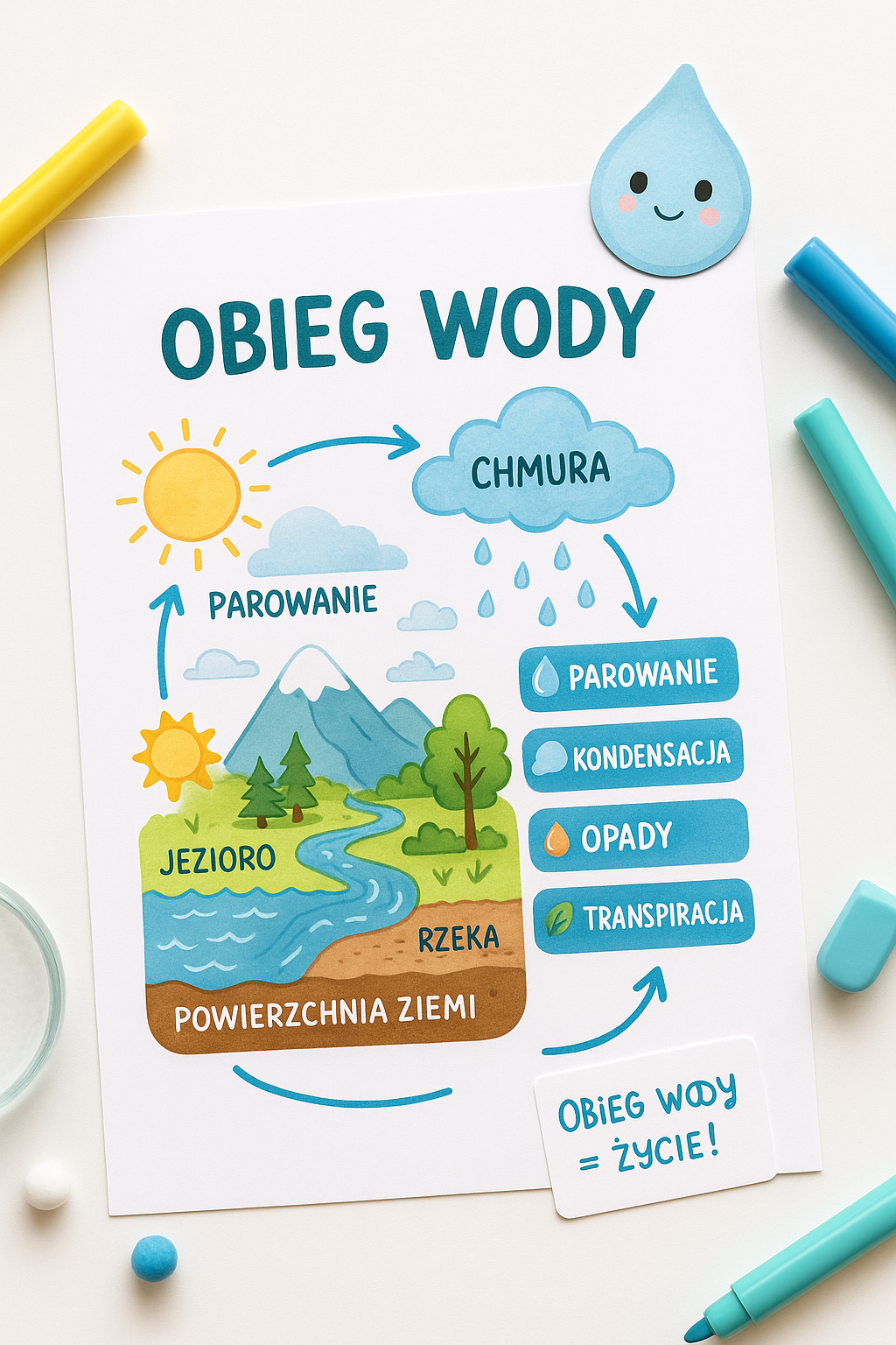 Przejrzysty, wielki schemat obiegu wody. Dziecko zobaczy, jak „krąży” każda kropla – od słońca po morze! 🌦️