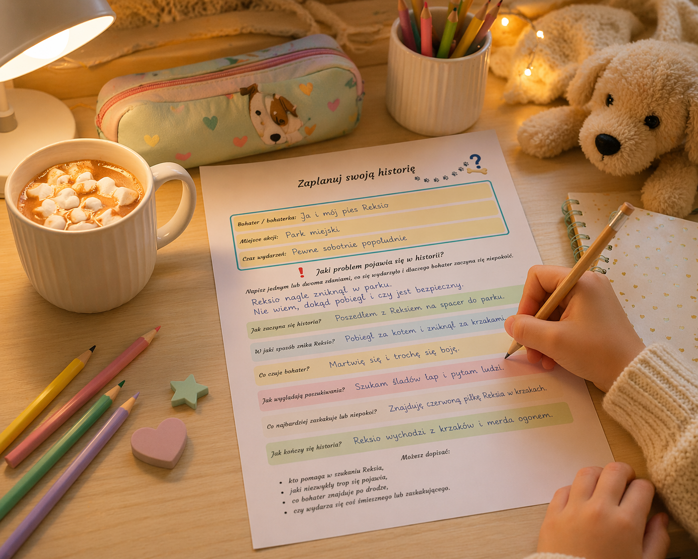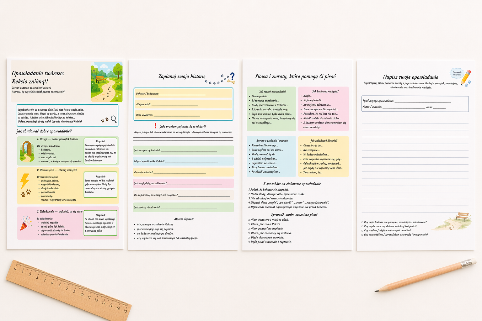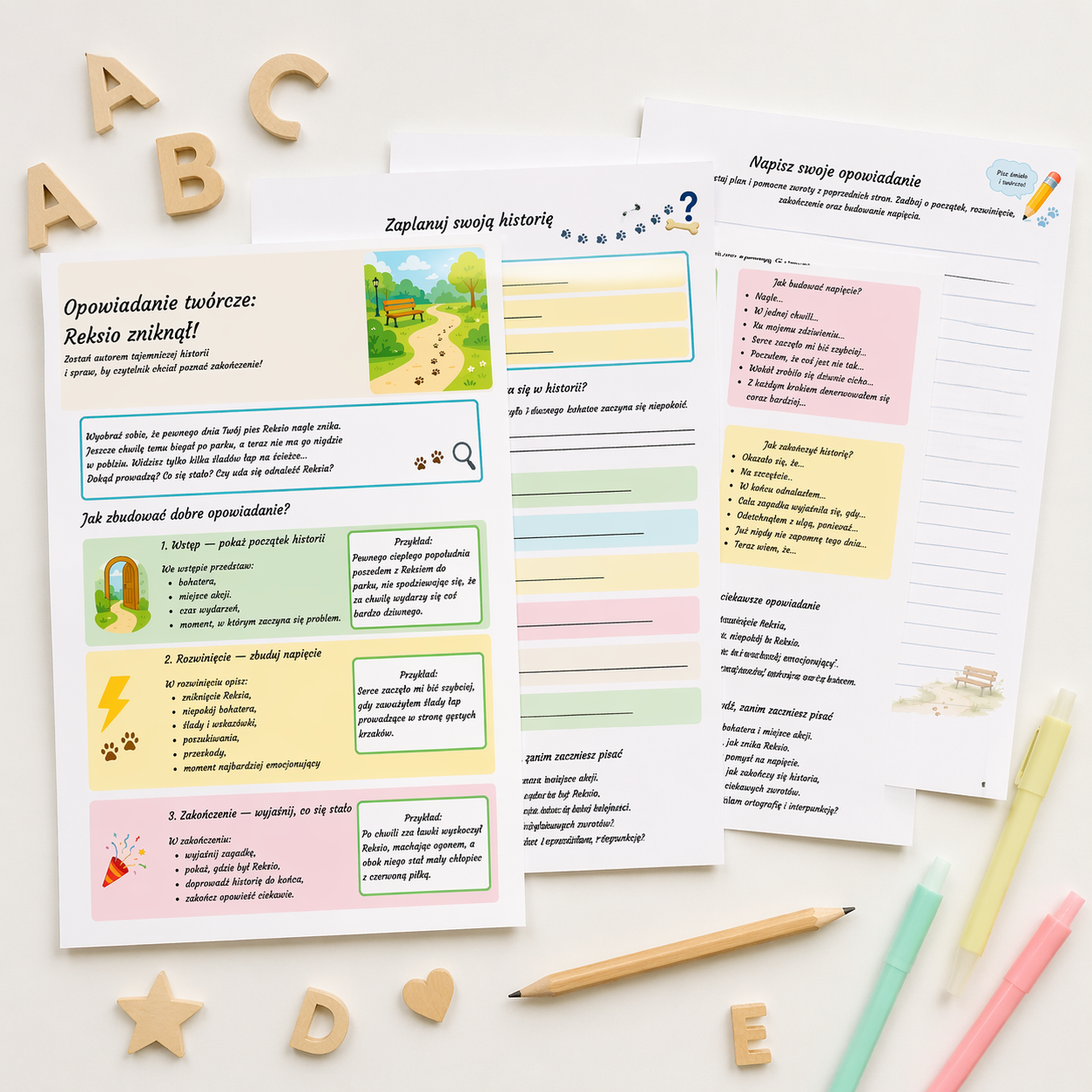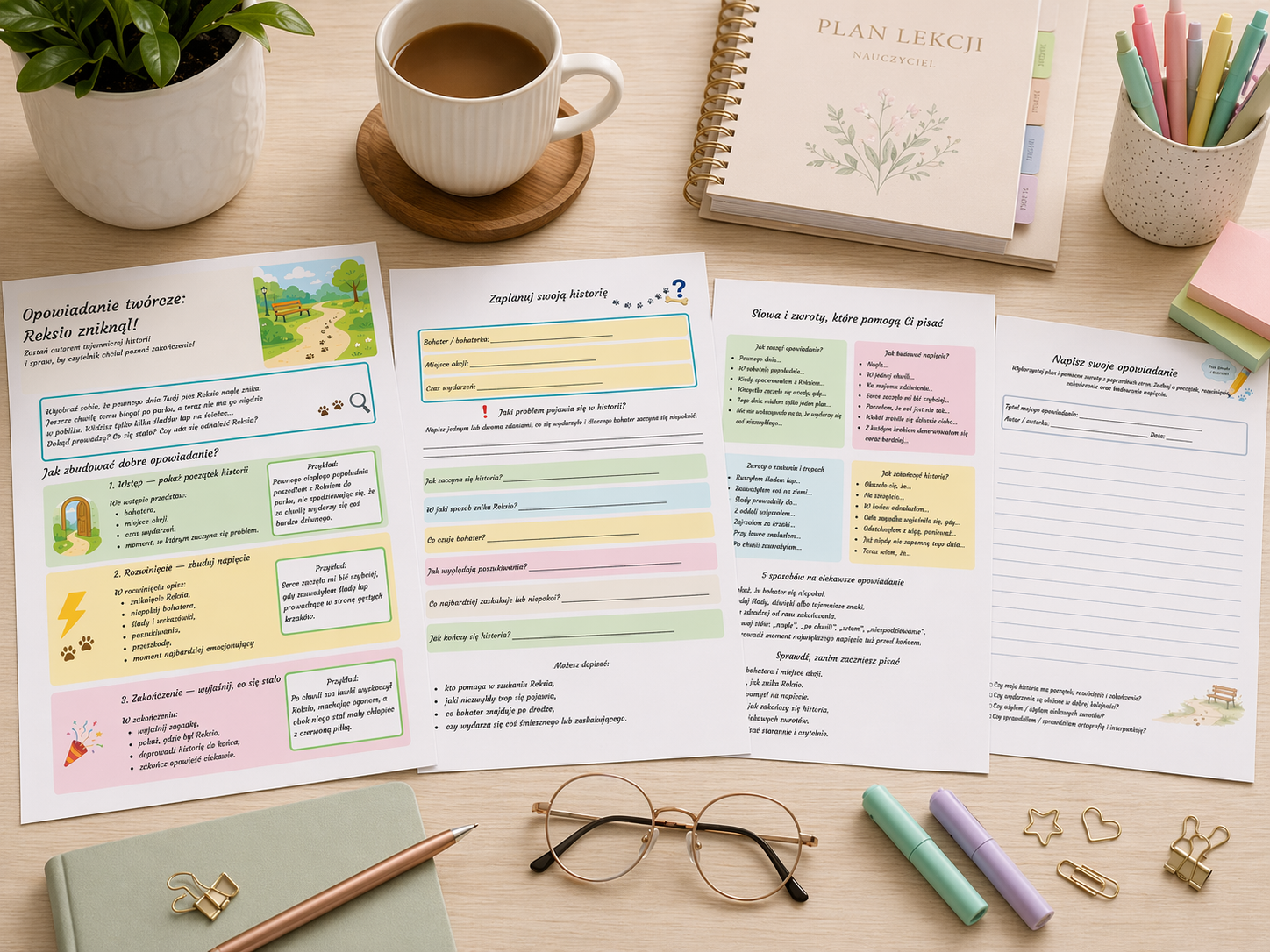Przygotowałam kartę pracy do tworzenia opowiadania pt. „Reksio zniknął!” 🐶✨ To materiał, który krok po kroku prowadzi uczniów przez cały proces pisania – od pomysłu, przez plan, aż do gotowego tekstu. Najpierw pokazuję, jak zbudować opowiadanie (wstęp, rozwinięcie i zakończenie), potem daję gotowy schemat do zaplanowania historii, a na końcu miejsce na napisanie własnej opowieści. Dodałam też przydatne zwroty i wskazówki, żeby łatwiej było budować napięcie i pisać ciekawie 📖💡 Całość jest przejrzysta, angażująca i gotowa do pracy na lekcji.