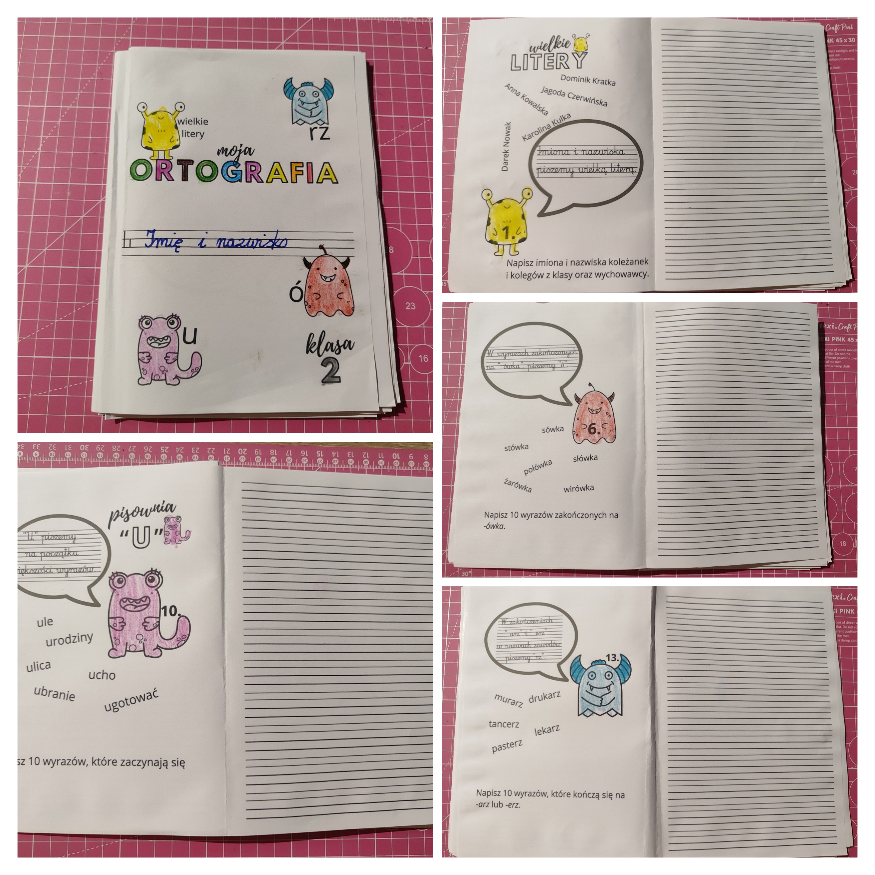 Książeczka zawierająca wyjaśnienie zasad dotyczących pisowni wyrazów wielką literą, z u, ó, rz na poziomie klasy 2 wraz z ćwiczeniami do każdej zasady.