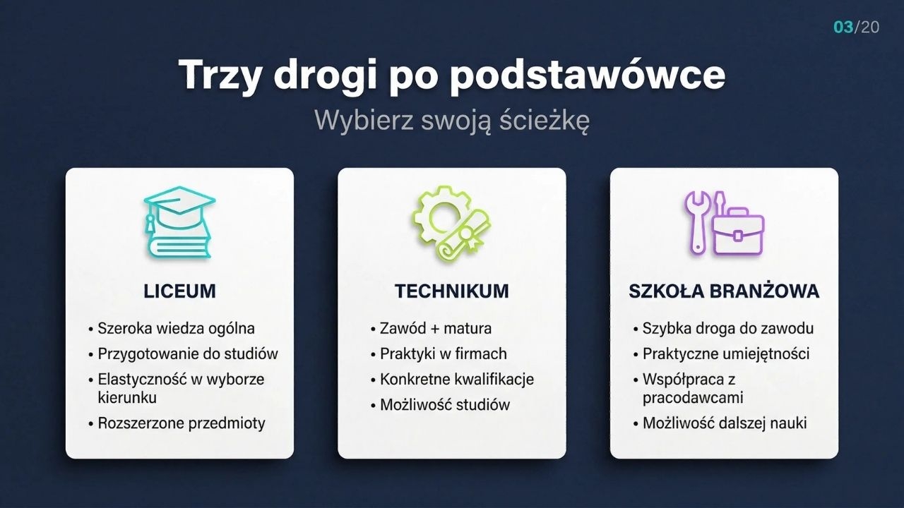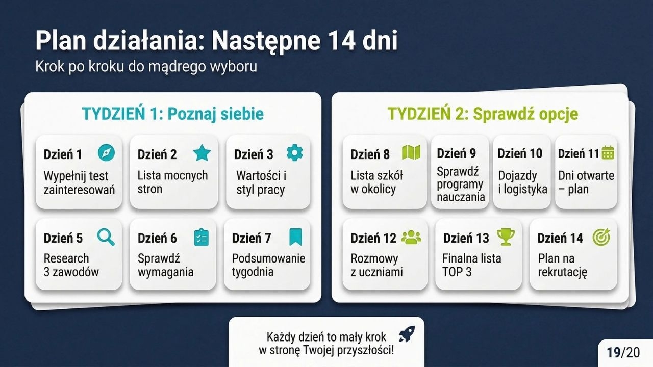 Jak pracować z materiałem? Jako gazetkę możesz wydrukować plansze w A4/A3 i ułożyć je w logicznej kolejności (od „mity vs fakty” i samooceny po rekrutację i plan 14 dni). W wersji zajęć najlepiej poprowadzić je warsztatowo: po planszach 5–8 uczniowie wypełniają miniankietę i zaznaczają swoje mocne strony oraz preferencje pracy, po planszy 15 tworzą własną checklistę TOP 3 szkół, a po planszy 19 wpisują w kalendarz konkretne działania na najbliższe dwa tygodnie.