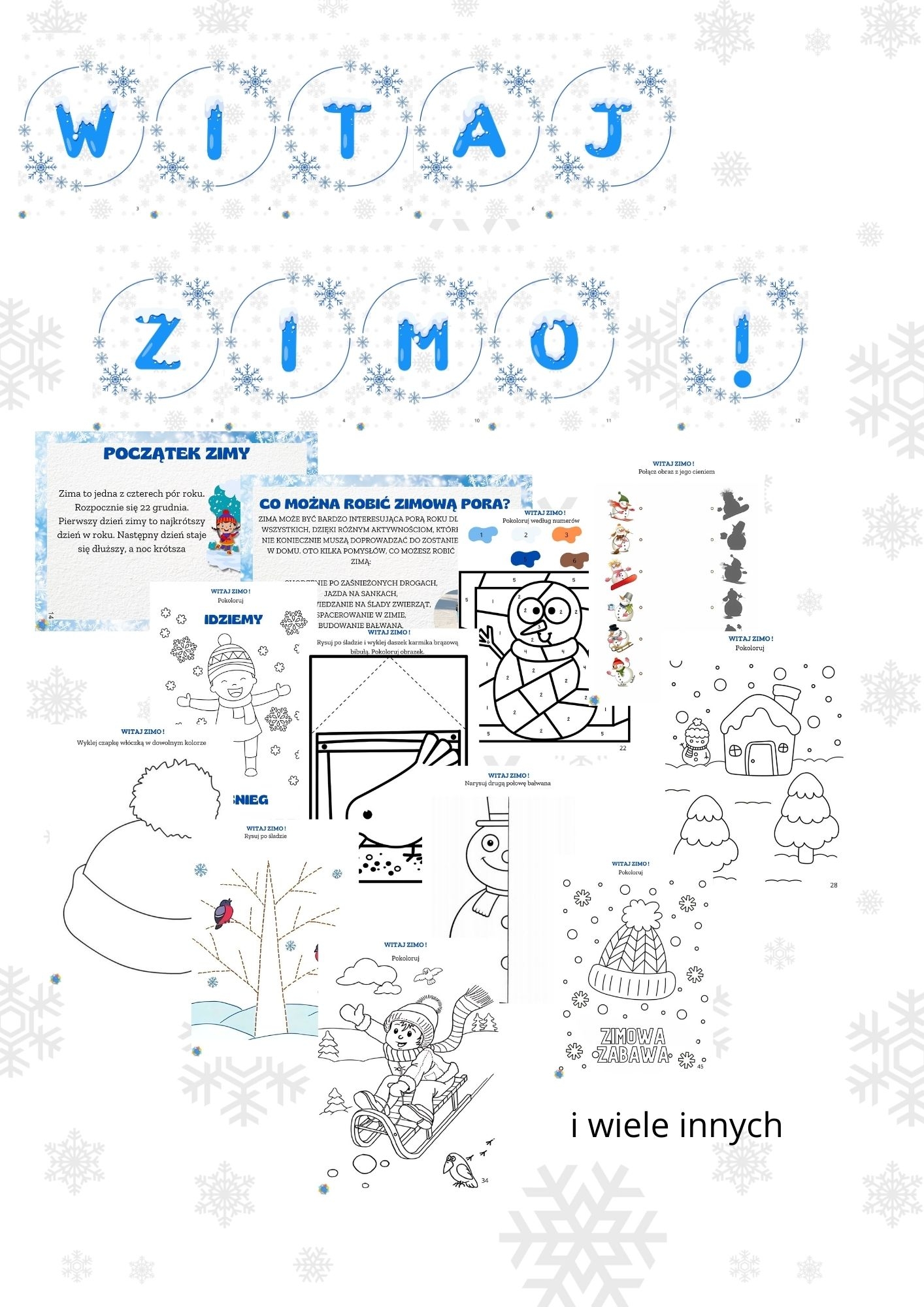 Kolorowanki, girlanda, gazetka do omówienia, labirynt bałwankowy, joga zimowa dla dzieci, ćwiczenia które można wykorzystać na gimnastykę, wyklejanki plastelinowe, dopasowywanie cieni, ćwiczenia w liczeniu śnieżynek i wiele wiele innych kart prac.