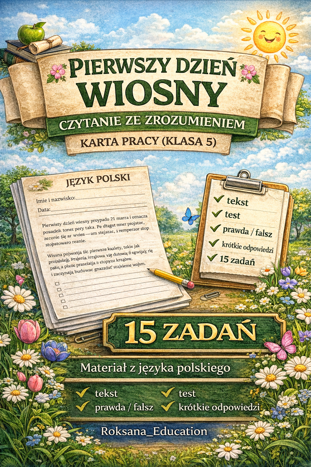 🌸 „Pierwszy dzień wiosny – czytanie ze zrozumieniem” to karta pracy przeznaczona dla uczniów klasy 5 szkoły podstawowej. Materiał rozwija umiejętność pracy z tekstem oraz pomaga utrwalić wiedzę o zmianach zachodzących w przyrodzie wiosną.
