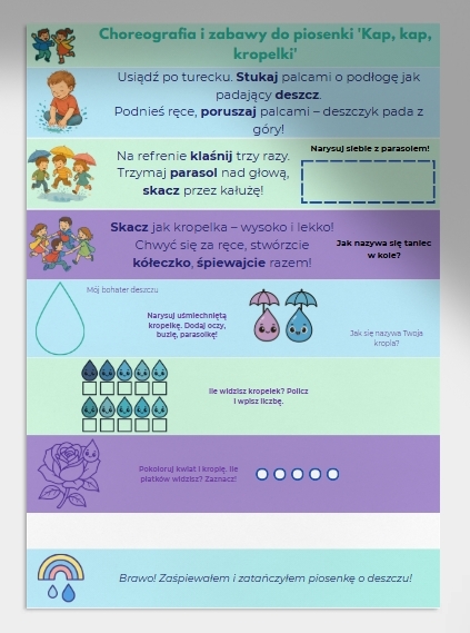 Prosta, angażująca choreografia – dzieci stukają palcami o podłogę, klaszczą, podnoszą ręce i skaczą przez kałuże! 🕺💧