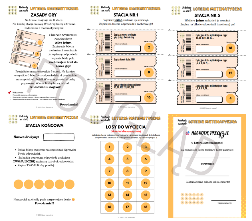 „Podchody na Start – Loteria Matematyczna” to gotowy zestaw do druku, który zmienia zwykłą lekcję w aktywną grę terenową z elementem losowania! Uczniowie chodzą między stacjami, wybierają bilety z zadaniami, zdobywają liczby i… czekają na losowanie zwycięzców!