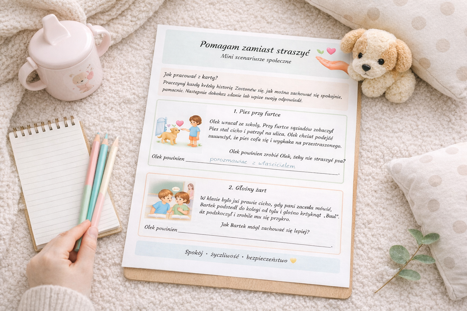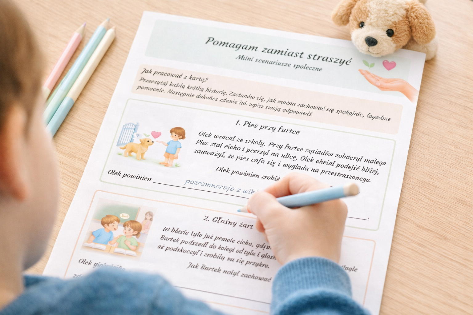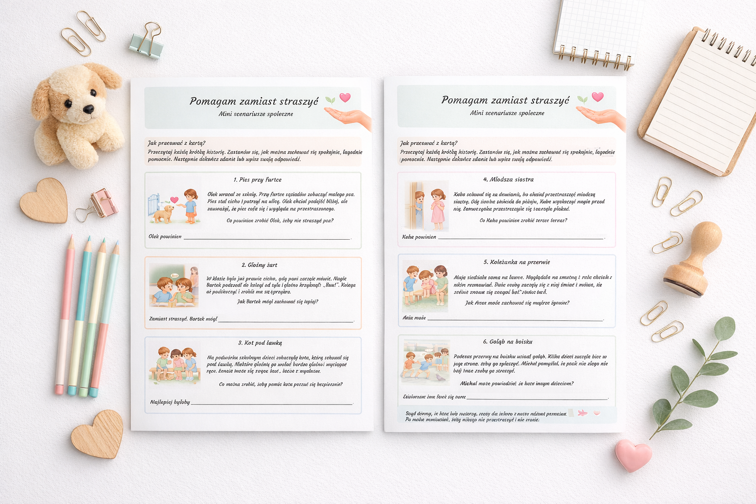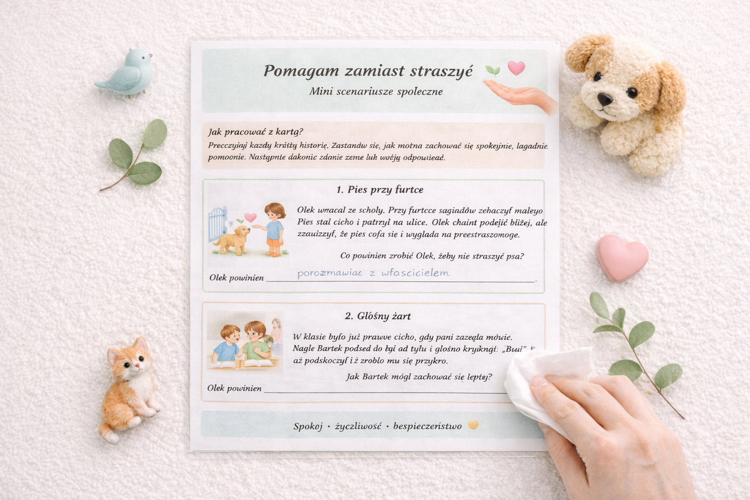W środku znajdują się 2 strony z 6 krótkimi scenariuszami społecznymi oraz dodatkowymi pytaniami do rozmowy. Dzieci uzupełniają zdania, kończą historie i uczą się, jak reagować z większą delikatnością, spokojem i troską. Na końcu znajduje się także prosta sekcja pomagająca rozpoznać, że ktoś się boi, na przykład gdy się odsuwa, milczy, płacze albo prosi, żeby przestać.