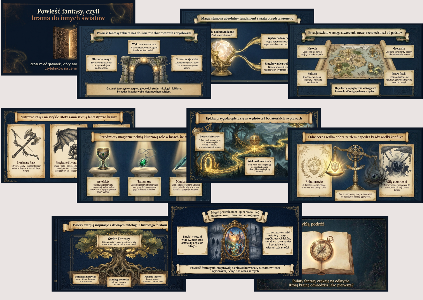 Gotowa prezentacja edukacyjna wprowadzająca uczniów w świat literatury fantasy. Materiał idealny na lekcje języka polskiego w klasach 4–6 – pomaga w przystępny i atrakcyjny sposób omówić cechy gatunku oraz rozbudzić zainteresowanie czytelnictwem.