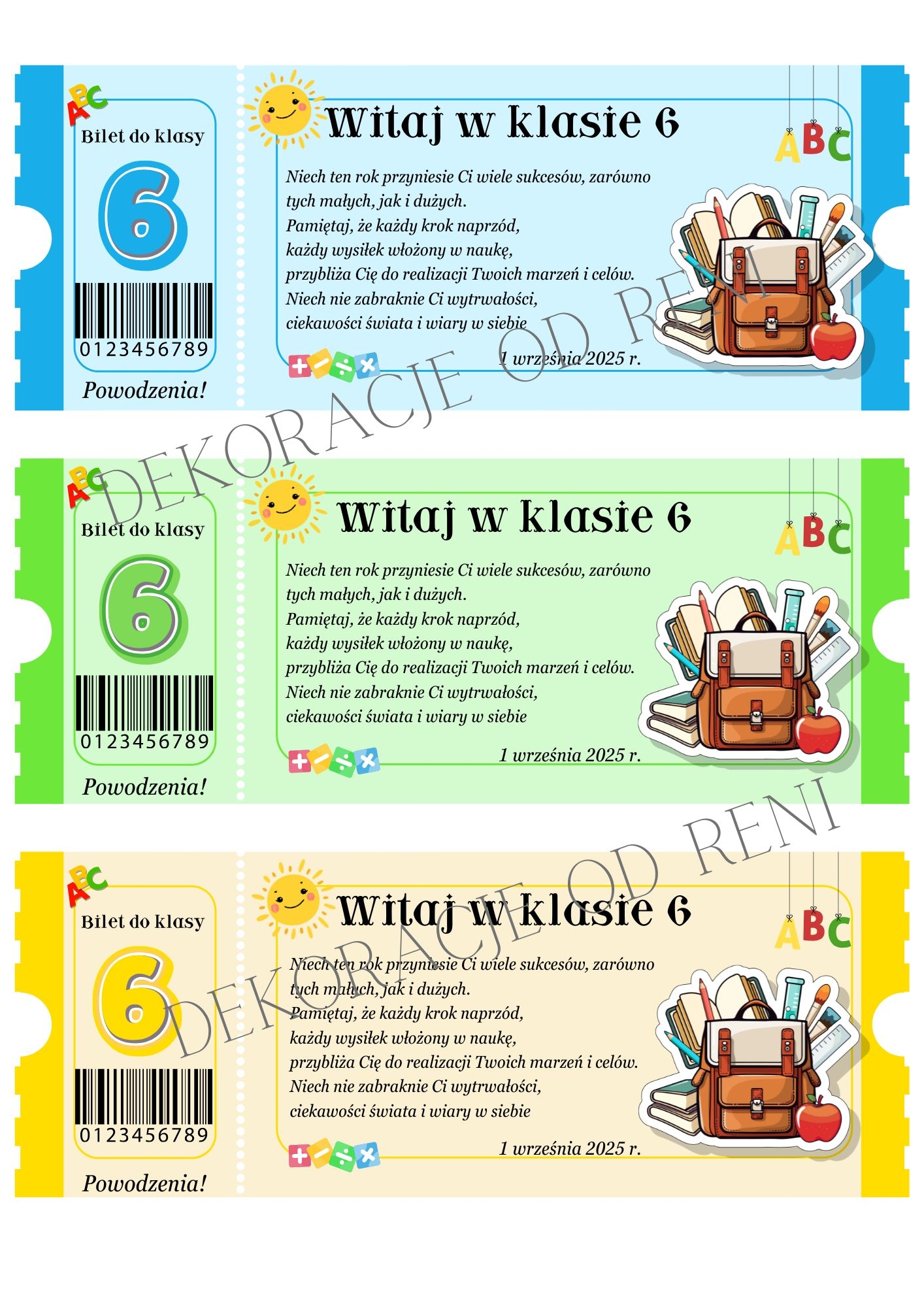 Powitalne Bilety do Klasy 6 to zestaw biletów w 6 kolorach (3 na A4).