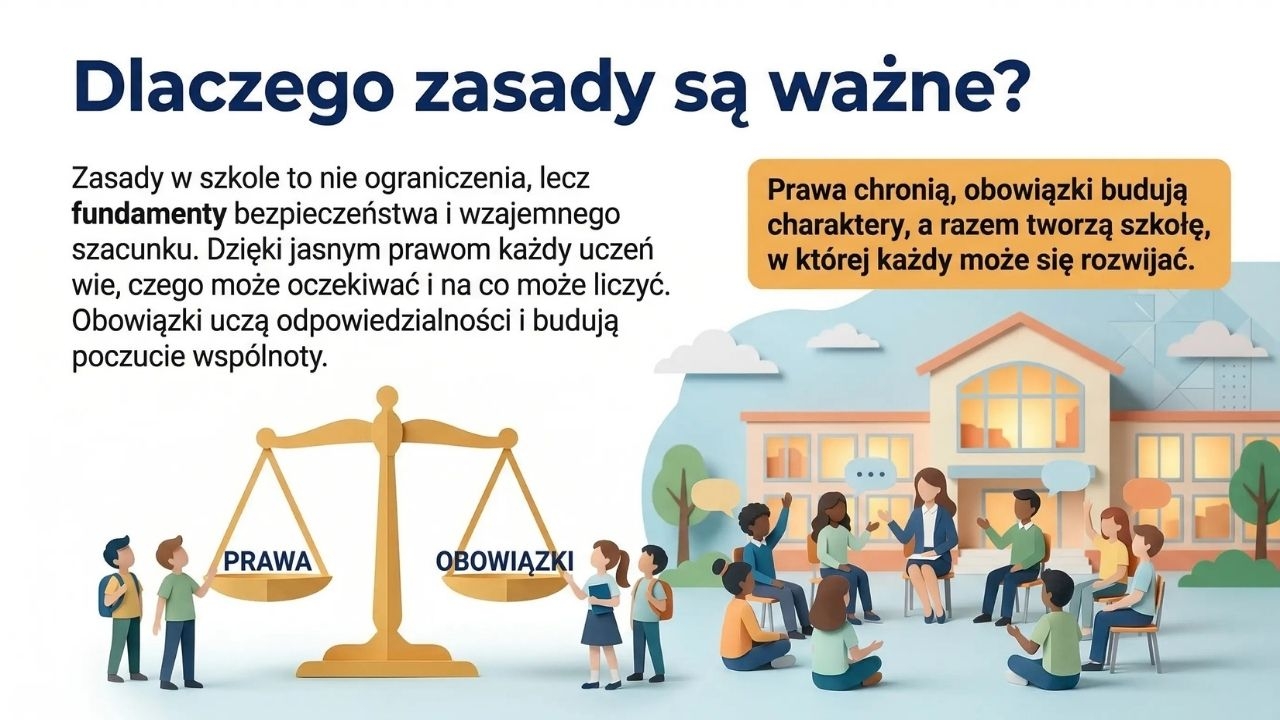 Prezentacja rozpoczyna się wprowadzeniem do tematu oraz przedstawieniem fundamentów praw ucznia, takich jak Konstytucja RP, Konwencja o Prawach Dziecka oraz statut szkoły. Następnie wyjaśnia, dlaczego zasady są ważne i jak wpływają na bezpieczeństwo oraz relacje w społeczności szkolnej.
