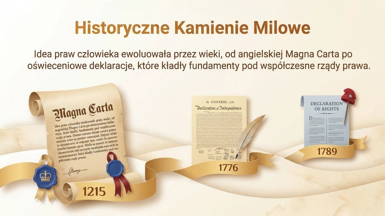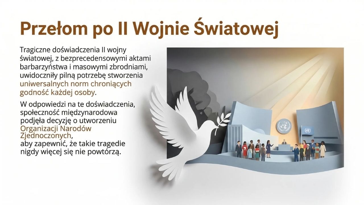 Na kolejnych slajdach omówiono: czym są prawa człowieka oraz ich niezbywalny charakter, zasadę powszechności i równości, a także współzależność praw. Uczeń poznaje historyczne źródła praw człowieka – od Magna Carta, przez deklaracje XVIII wieku, aż po wydarzenia po II wojnie światowej i powstanie ONZ. W dalszej części zaprezentowano Powszechną Deklarację Praw Człowieka oraz najważniejsze prawa, takie jak prawo do życia, wolności i bezpieczeństwa.