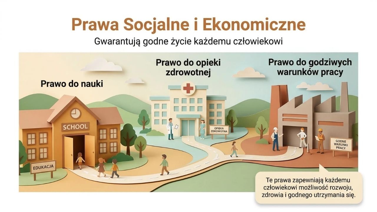 Materiał obejmuje również podział praw na osobiste, polityczne, społeczne i ekonomiczne, a także szczególną ochronę praw dziecka wraz z ich kategoriami. Uczniowie poznają instytucje stojące na straży praw w Polsce oraz rolę organizacji pozarządowych. Prezentacja zawiera także praktyczne wskazówki, jak reagować na naruszenia praw człowieka.