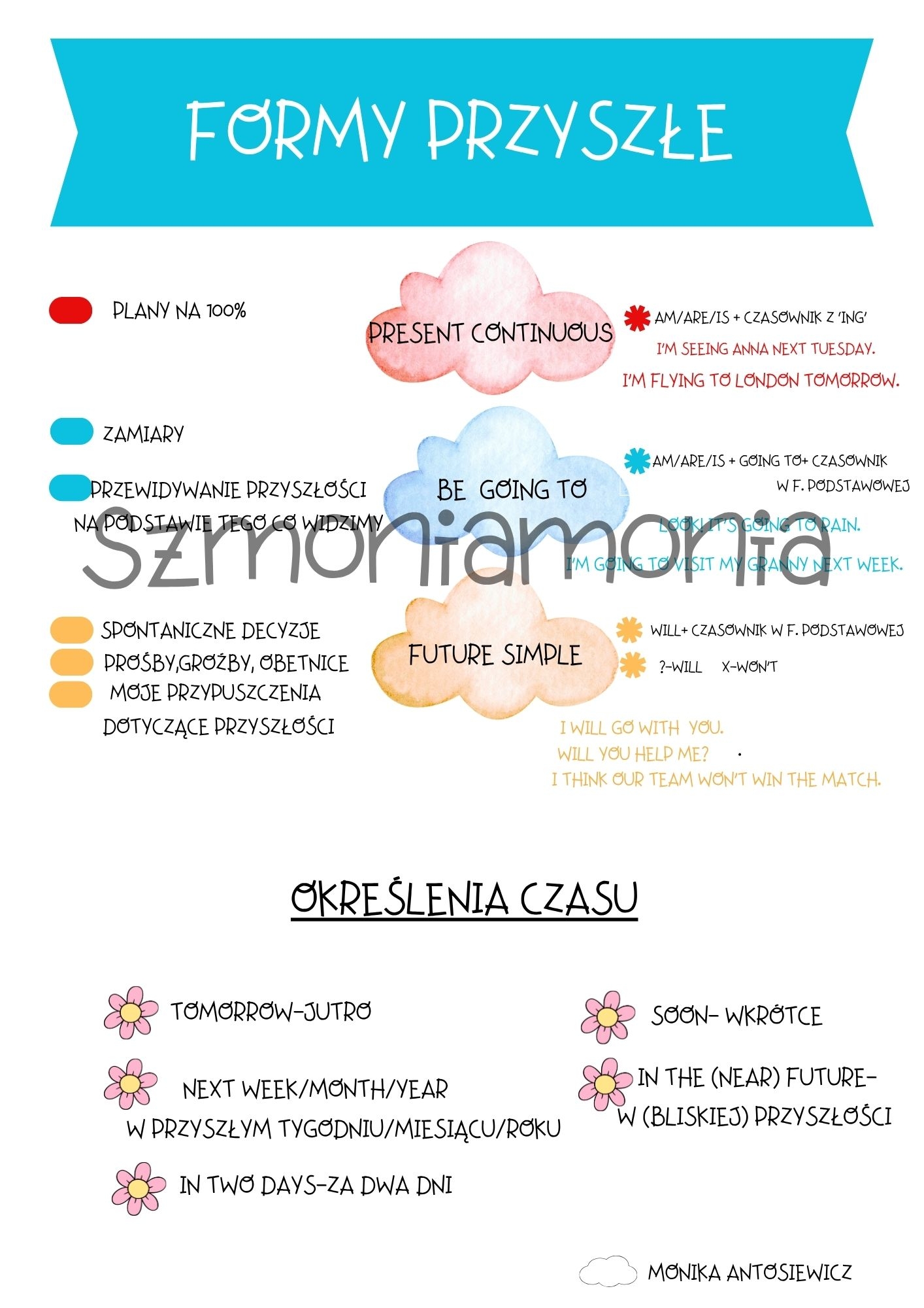 Podsumowanie form przyszłych czasów: Present Continuous w odniesieniu do przyszłości, konstrukcji be going to oraz Future simple -budowa i zastosowanie w atrakcyjnej wizualnie i łatwo przystępnej formie.