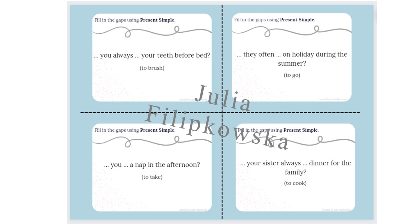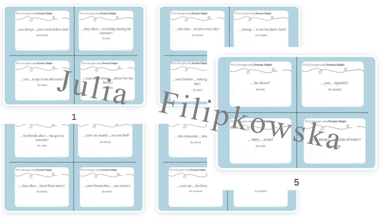 Zapraszam do zakupu materiału w języku angielskim: 20 kart do ćwiczenia Present Simple w mowie (5 stron A4). Zadanie polega na uzupełnieniu zdania brakującym (podanym) czasownikiem używając Present Simple. Materiał idealny na rozgrzewkę przypominającą gramatykę dla uczniów na początek zajęć, lub dla uczniów przygotowujących się do różnych egzaminów. Polecam karty wyciąć i zalaminować dzięki czemu wystarczą na wiele lat.