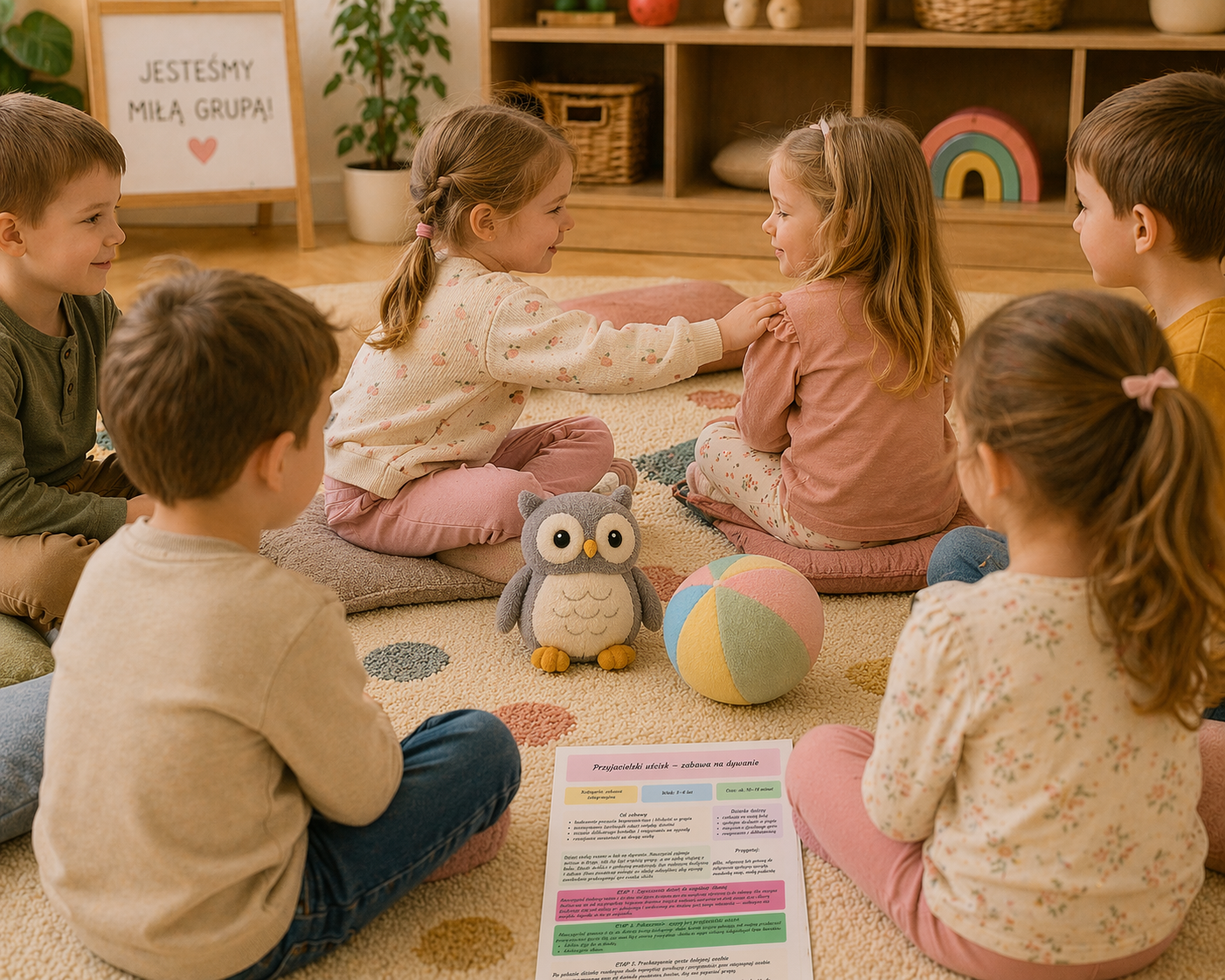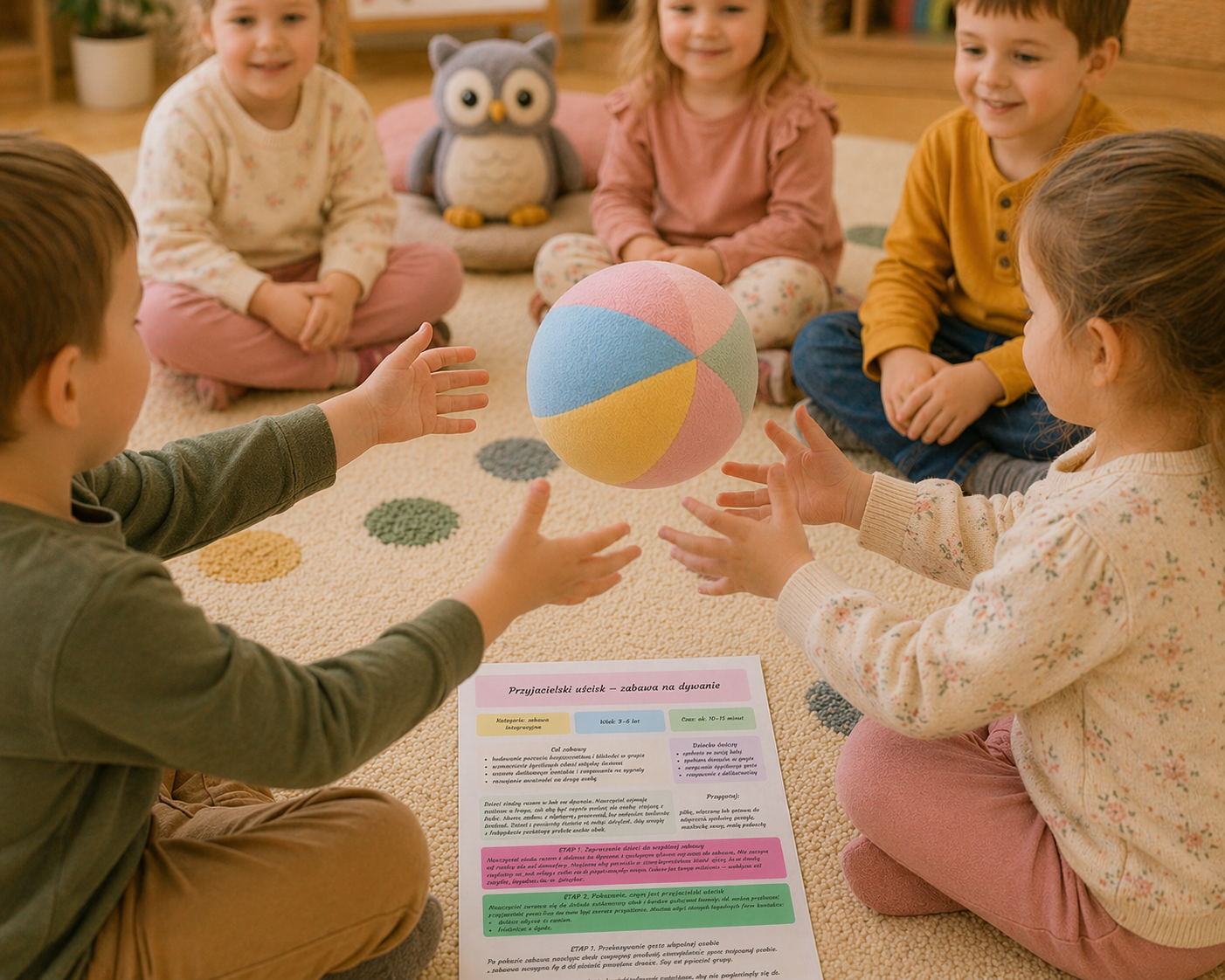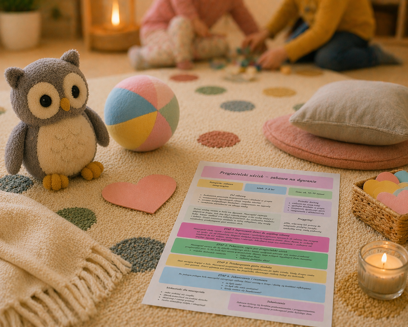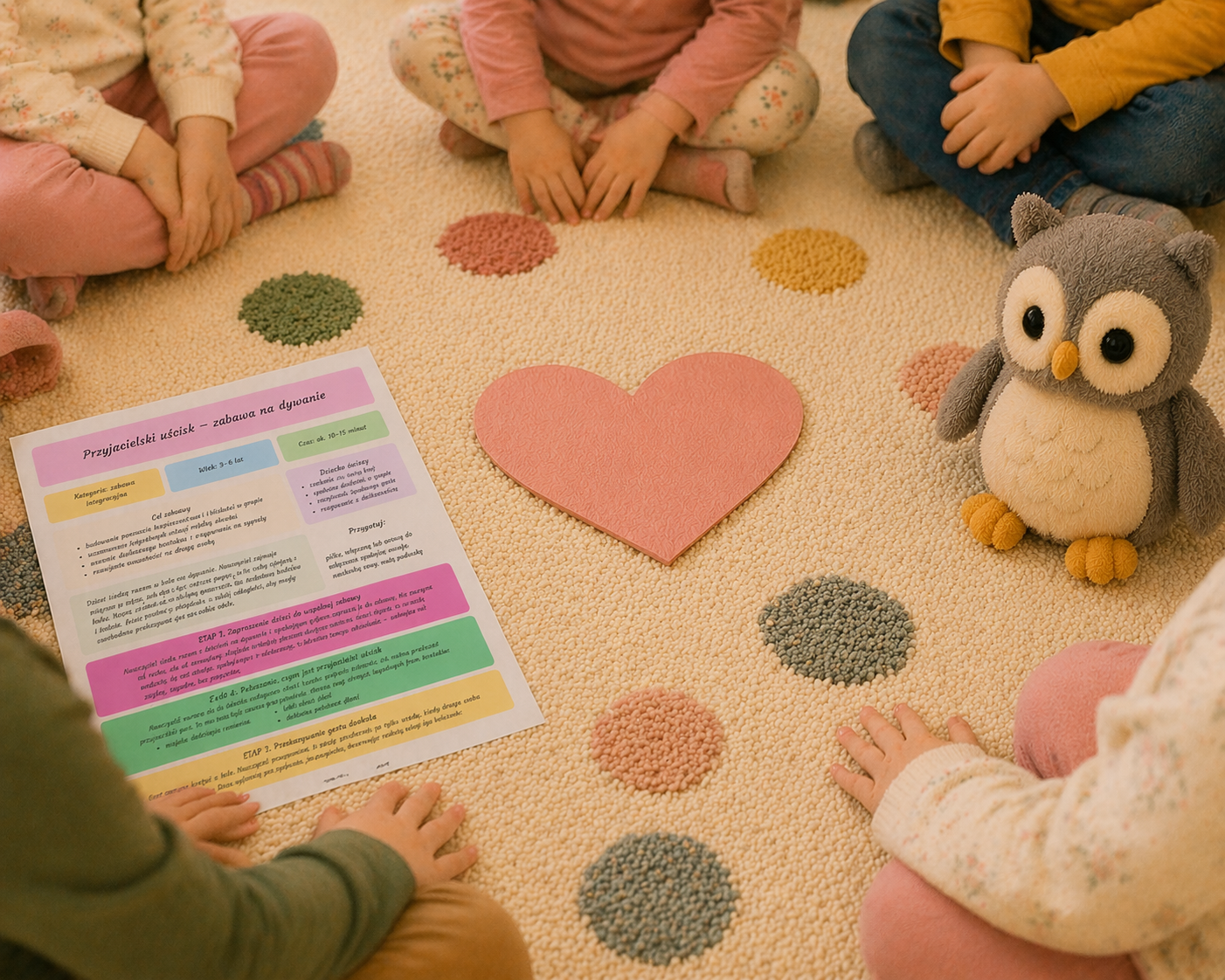 To ciepła, wyciszająca zabawa dla dzieci (3–6 lat), która buduje poczucie bezpieczeństwa, bliskości i życzliwości w grupie 🤝✨
