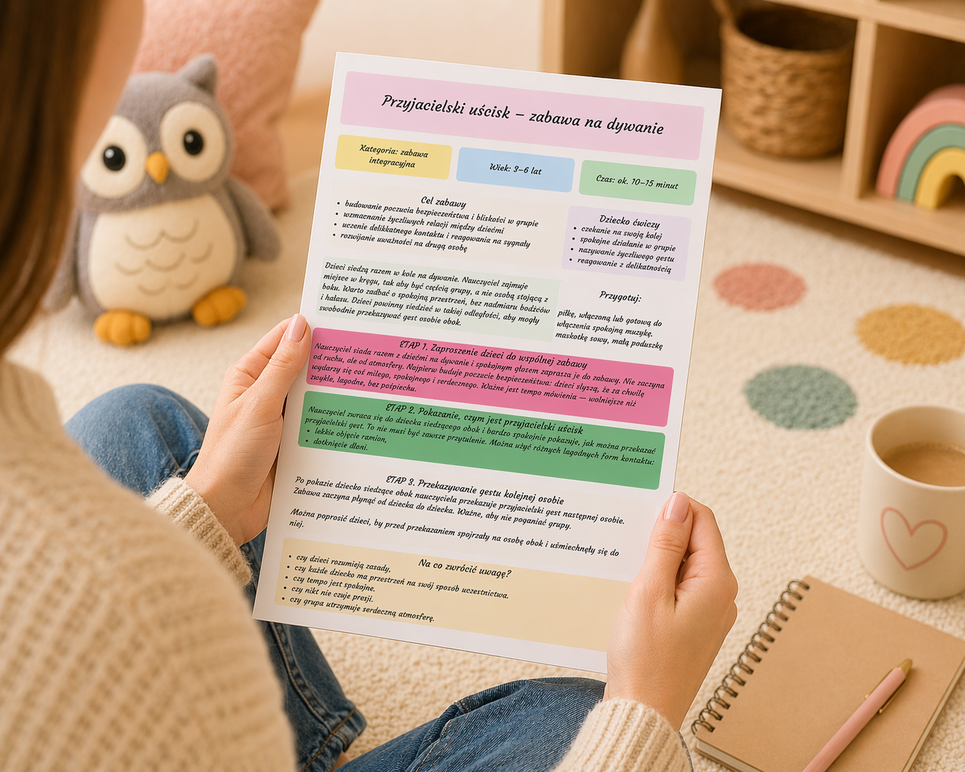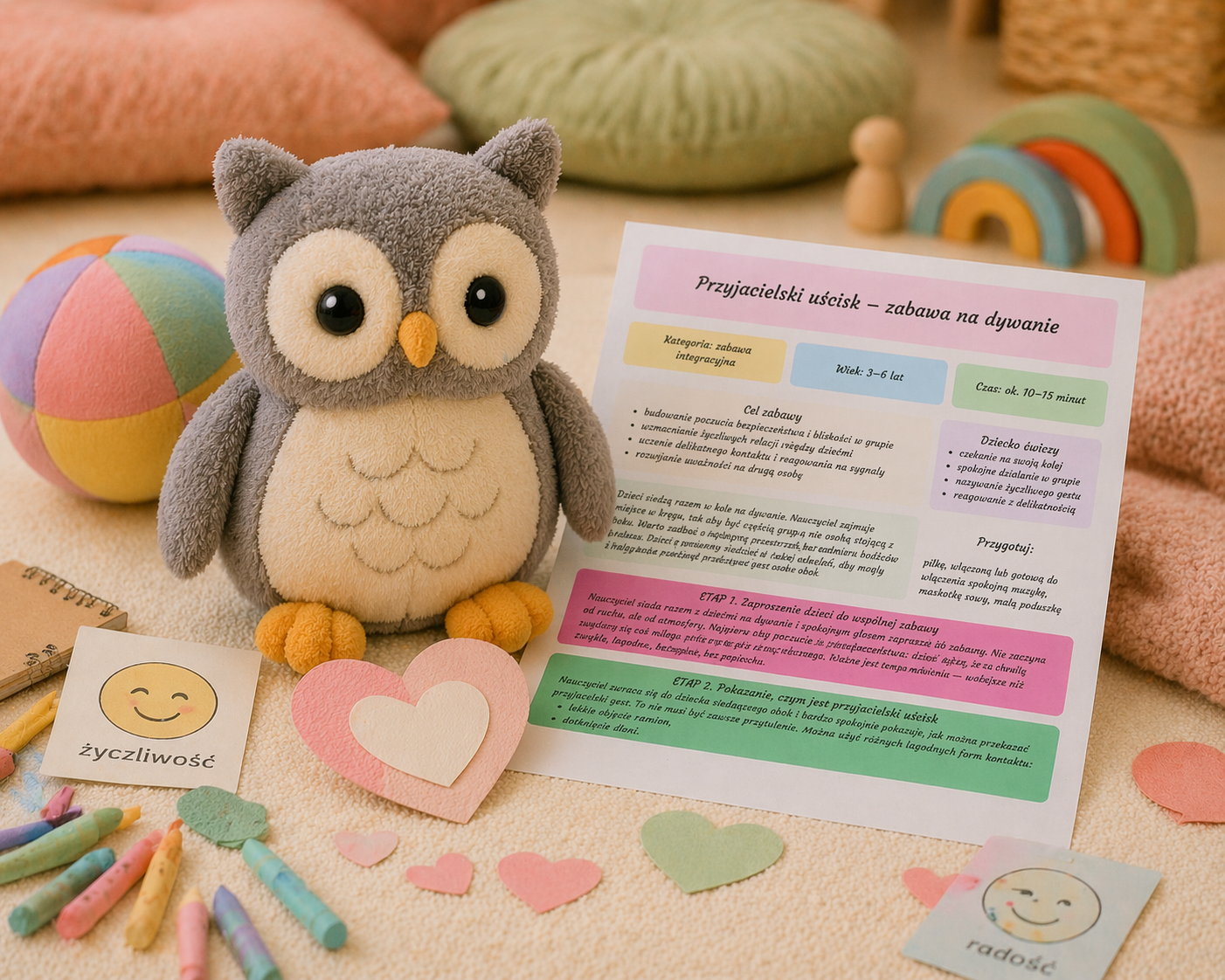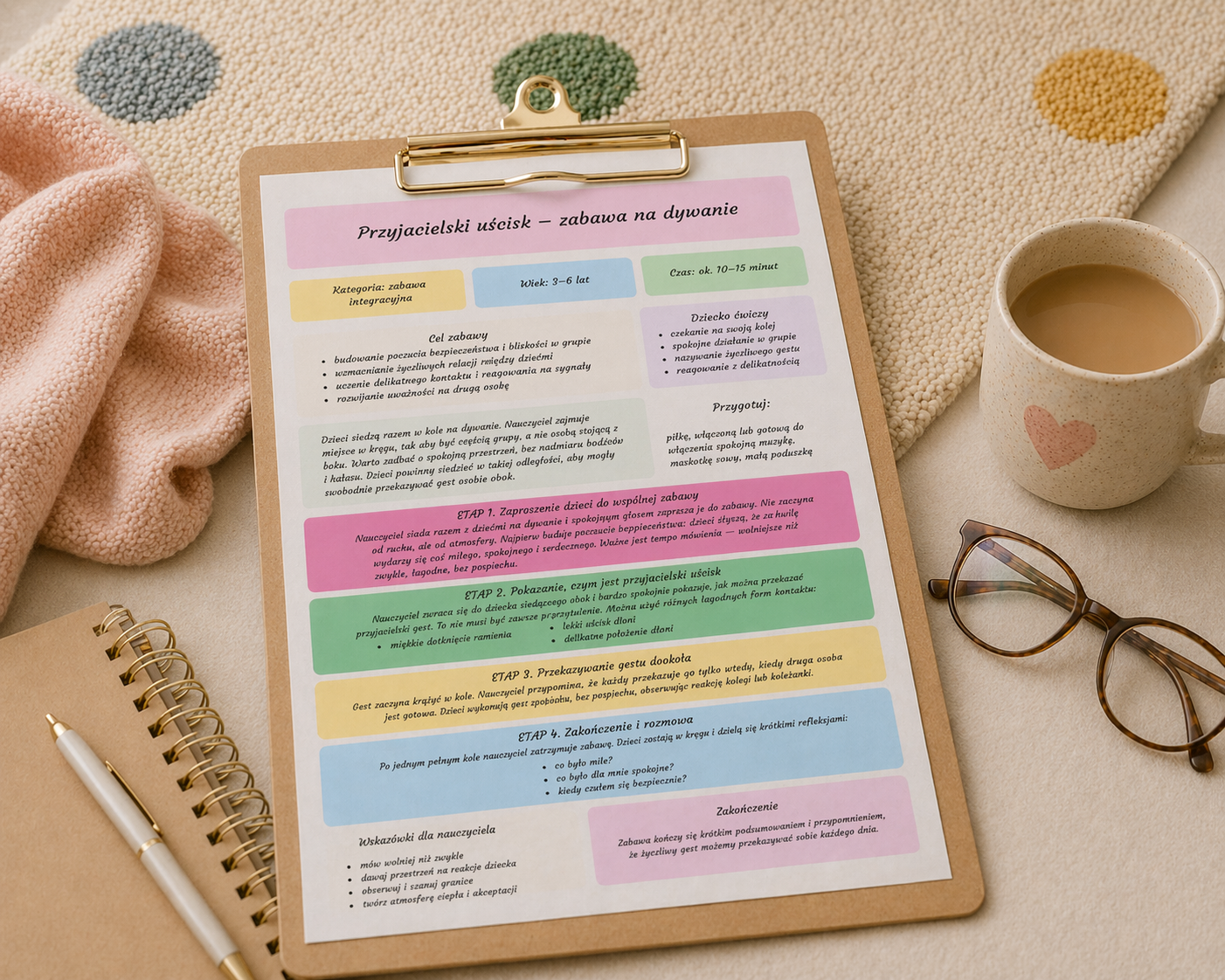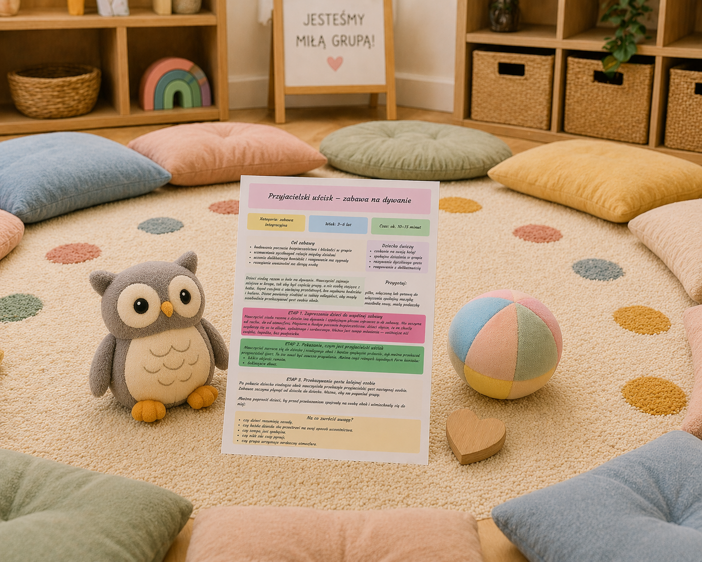 To ciepła, wyciszająca zabawa dla dzieci (3–6 lat), która buduje poczucie bezpieczeństwa, bliskości i życzliwości w grupie 🤝✨
