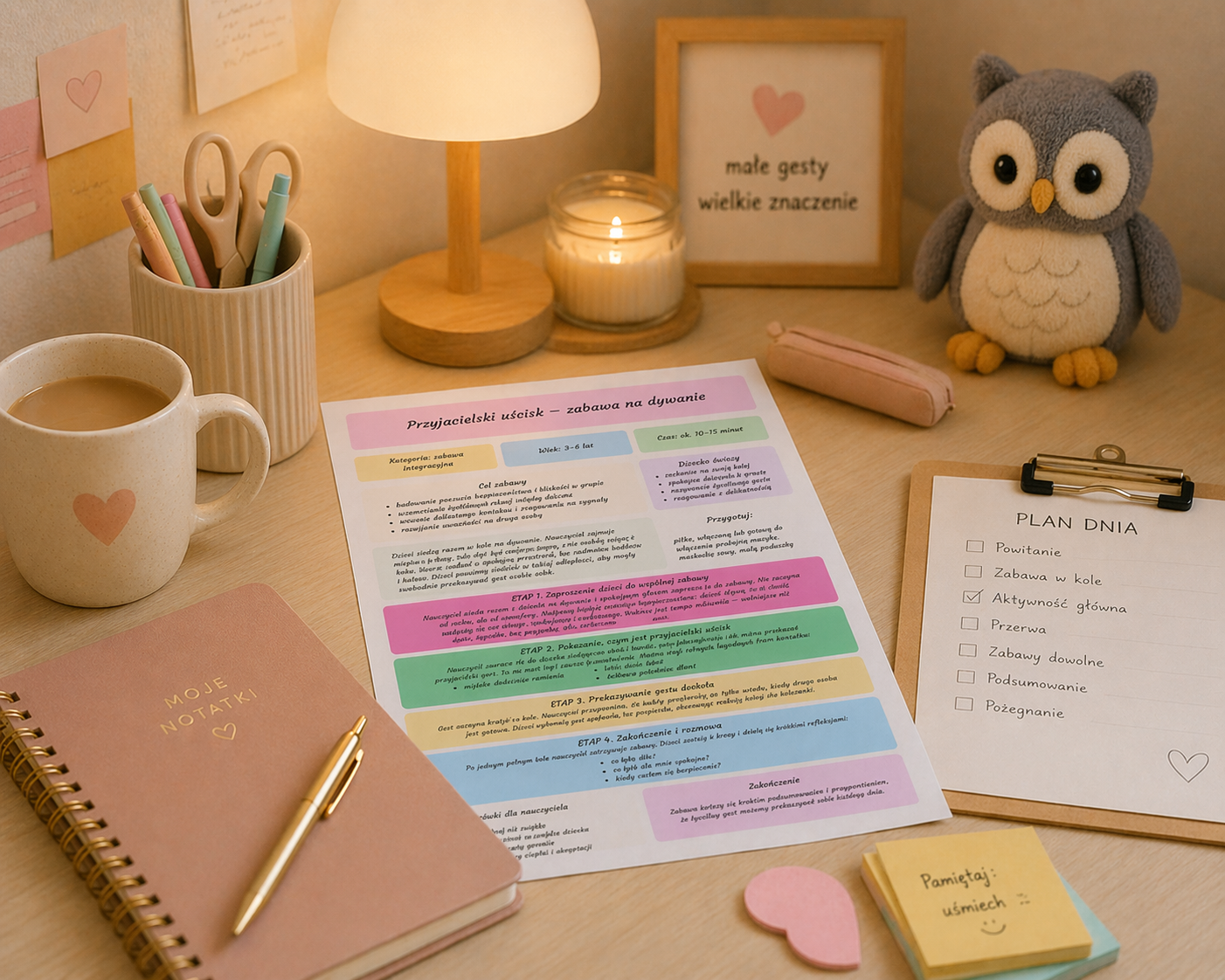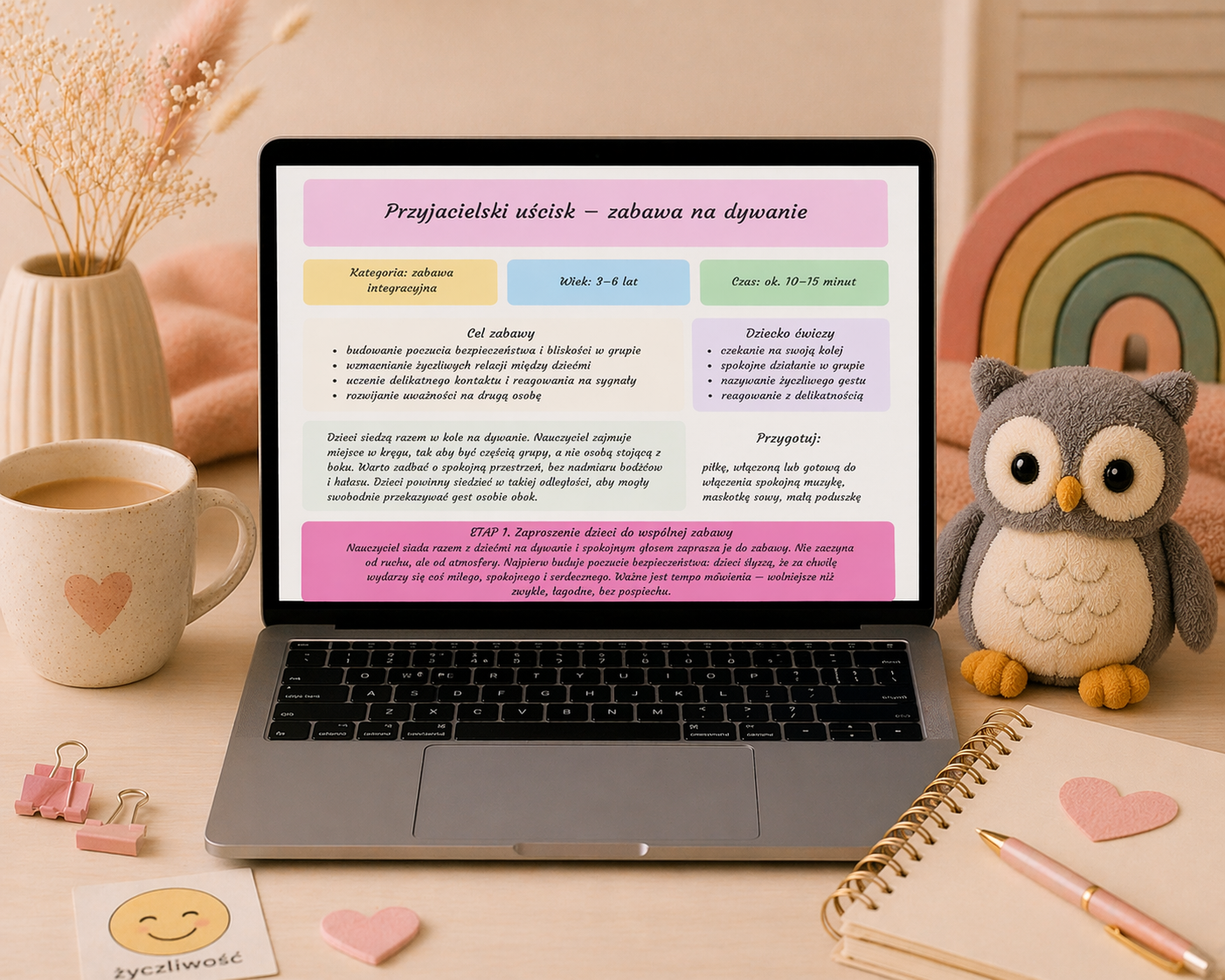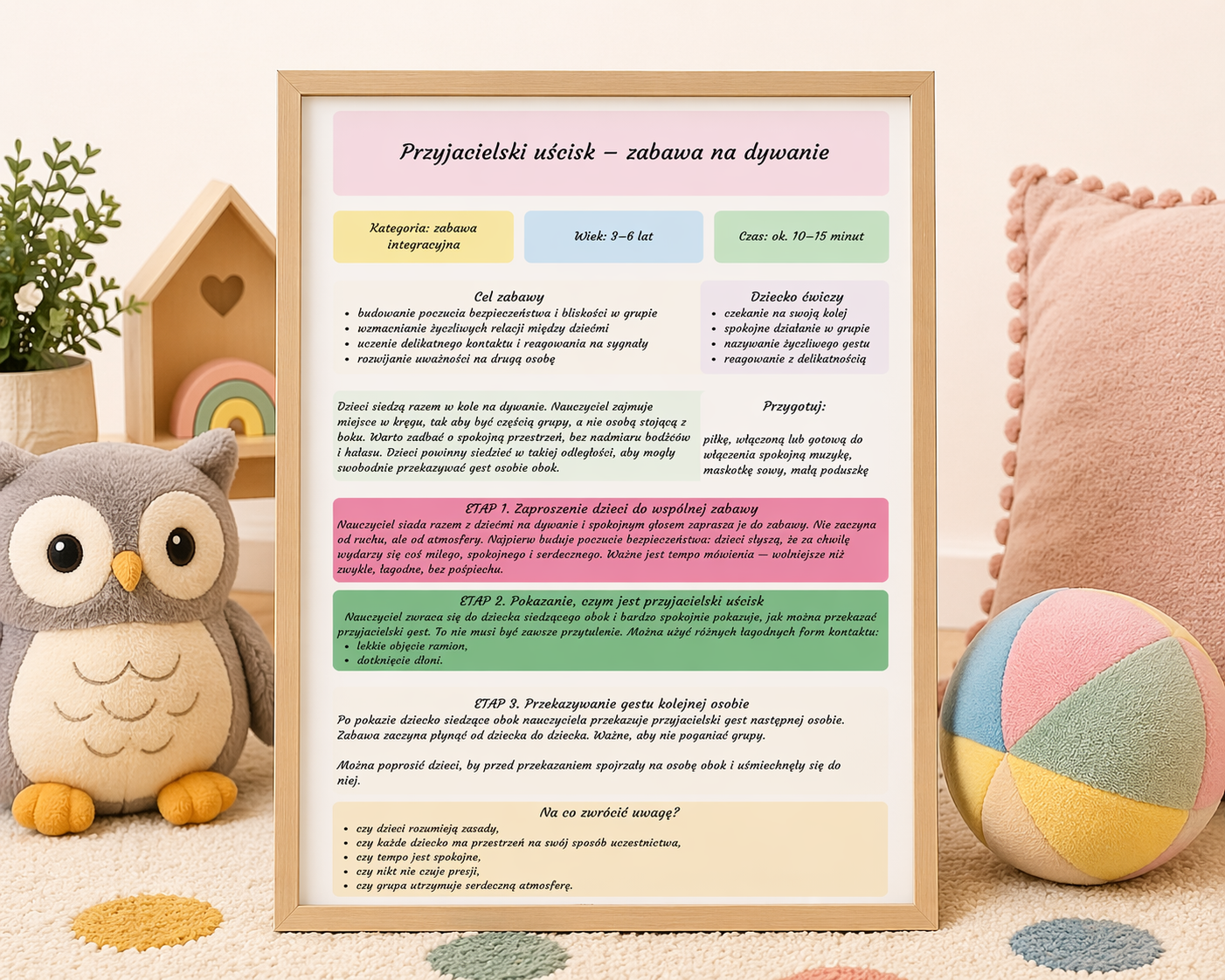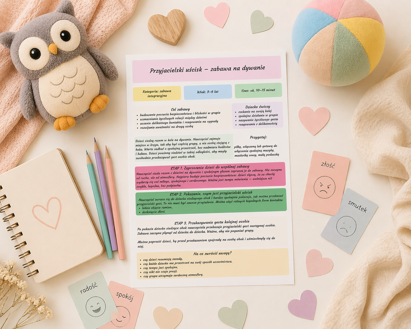 Nauczyciel zaczyna od przekazania delikatnego, przyjacielskiego gestu (np. uścisku, dotknięcia dłoni) kolejnemu dziecku 💞