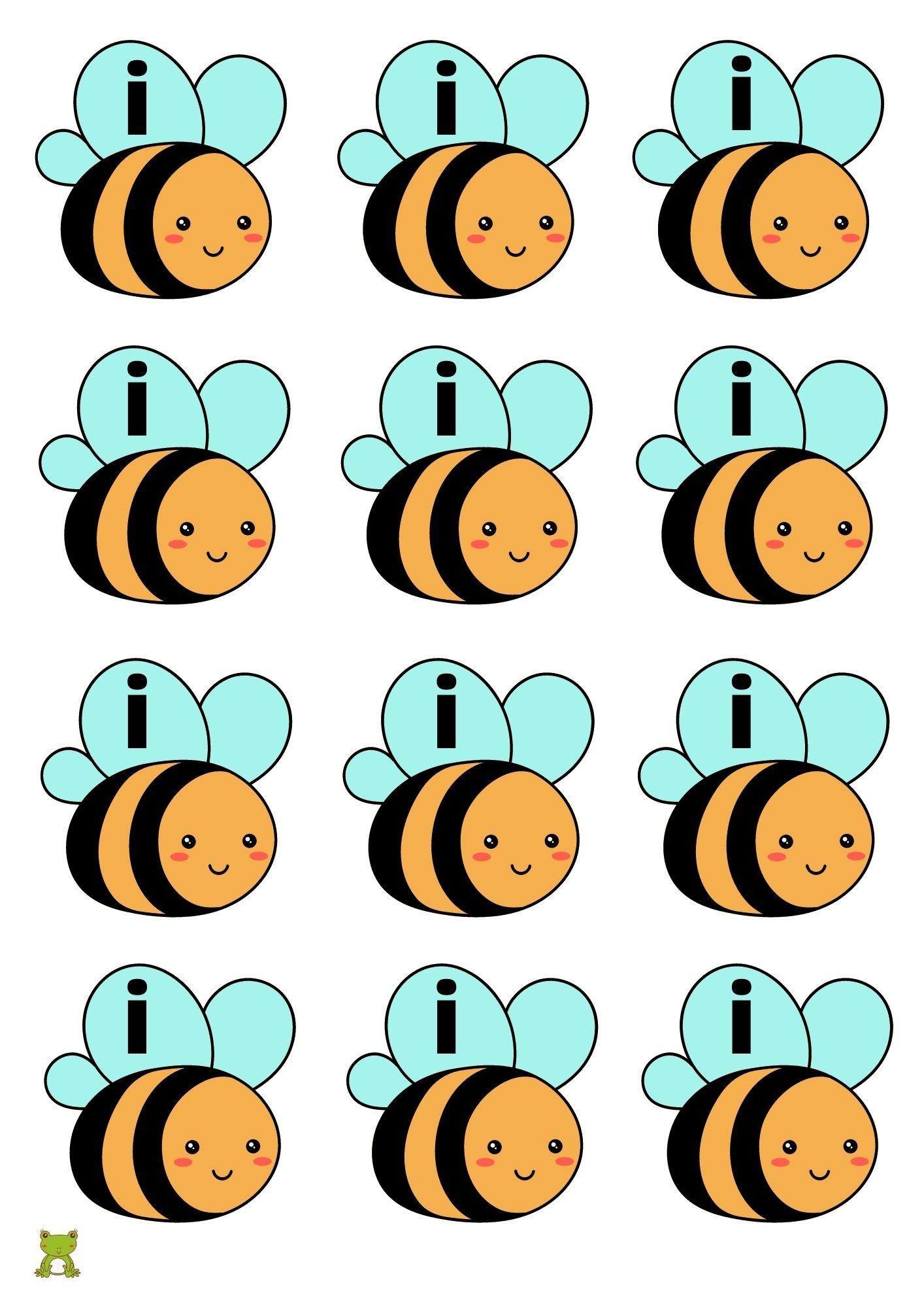 Karty utrwalające samogłoski. Zalaminuj i wytnij pszczółki i dopasuj je do odpowiedniego plastra miodu. Można przenosić je słomką lub wrzucać do pudełka z dziurką i odpowiednio przyklejonym plastrem.