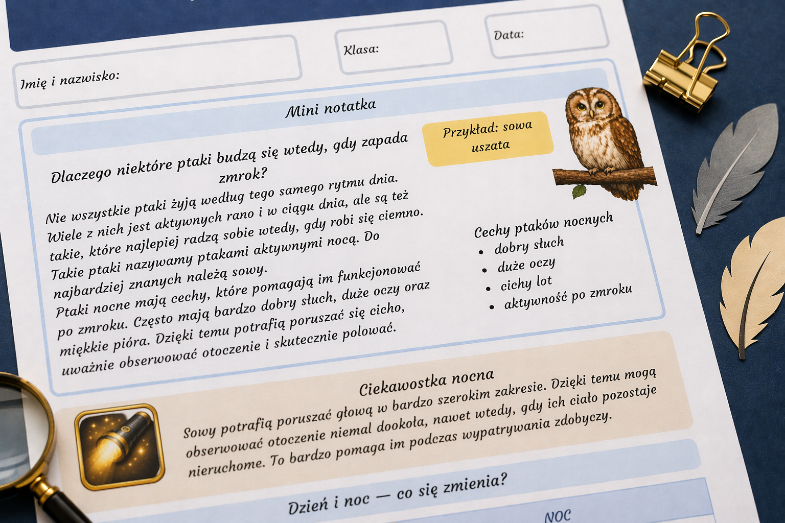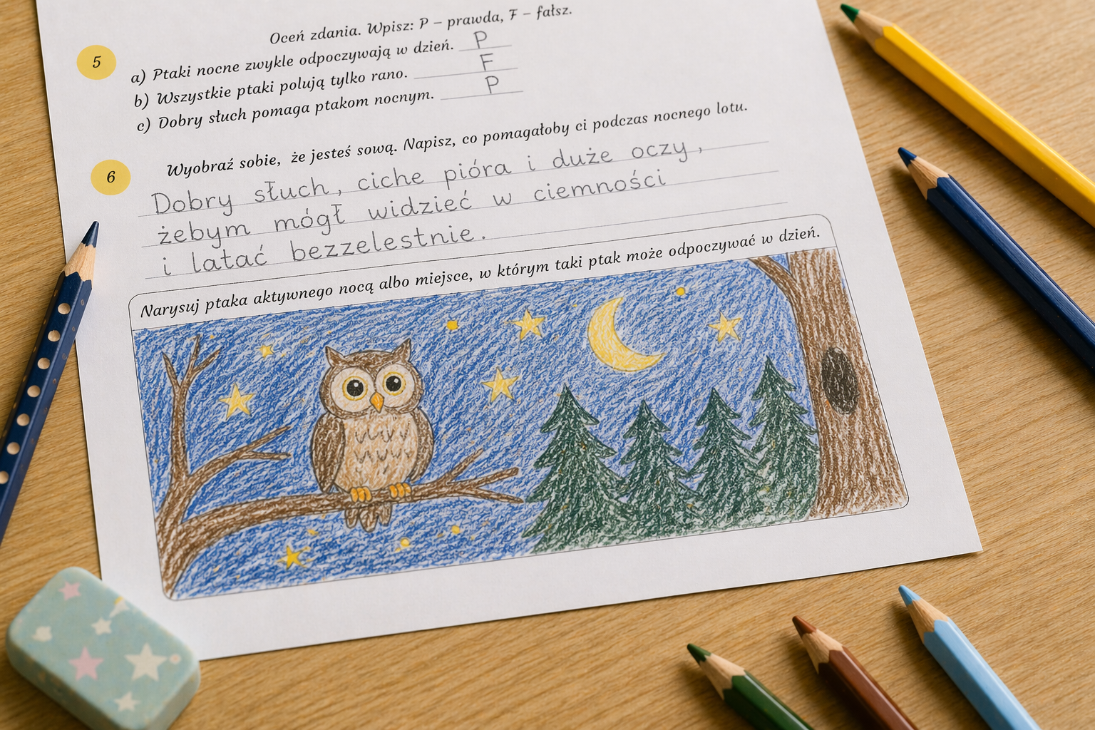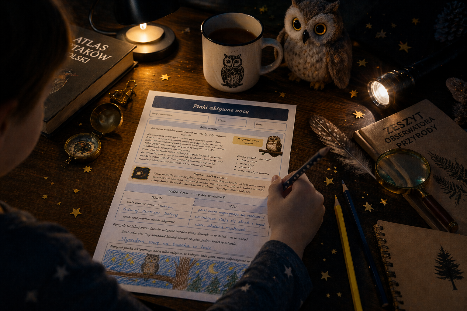 📘 Mini notatkę wyjaśniającą, czym są ptaki nocne i dlaczego działają po zmroku