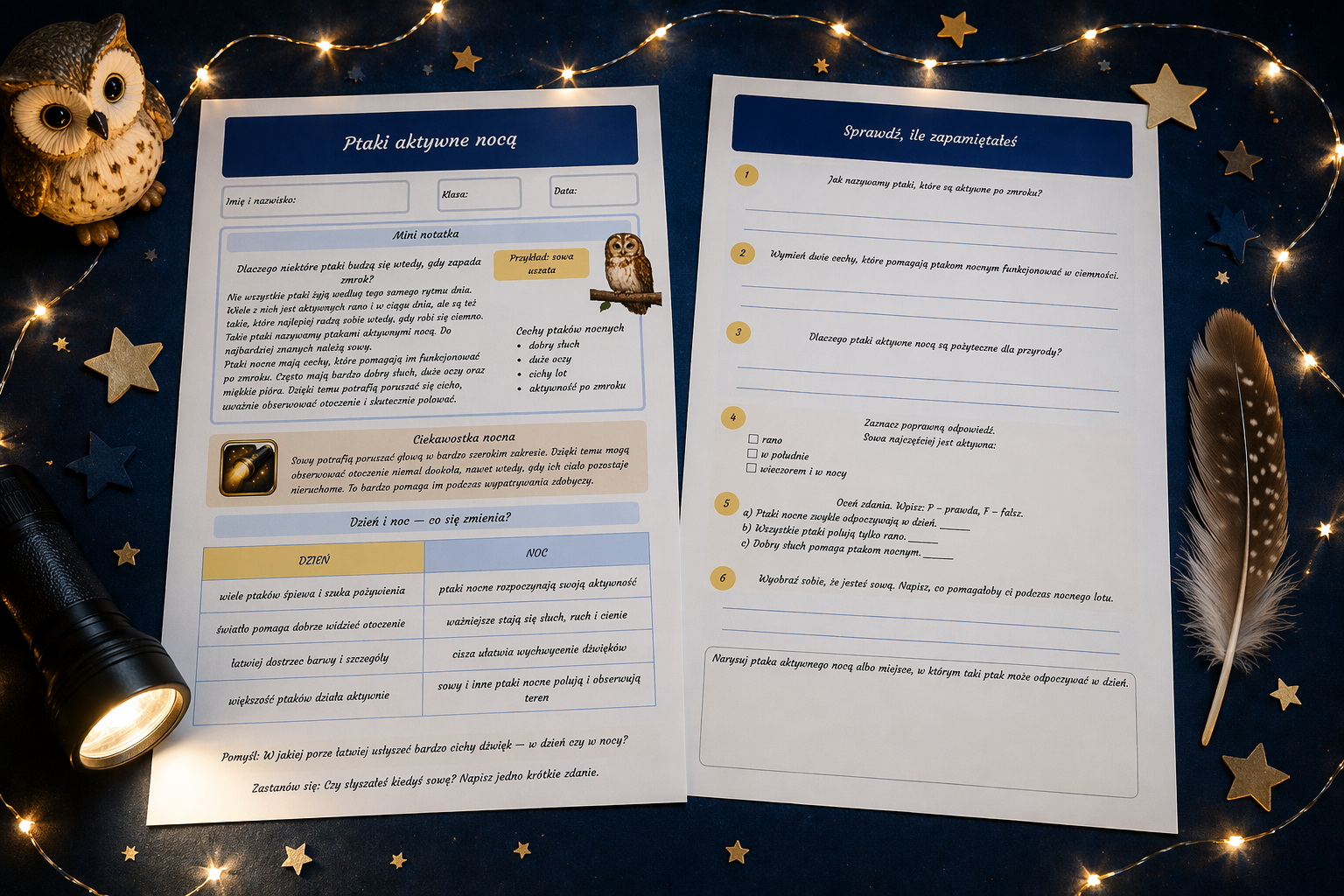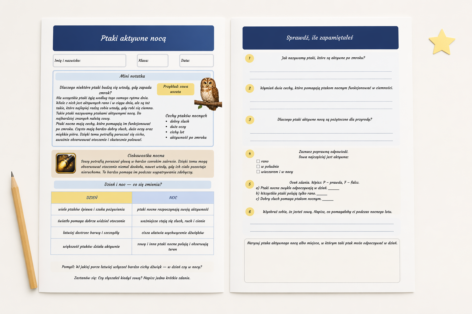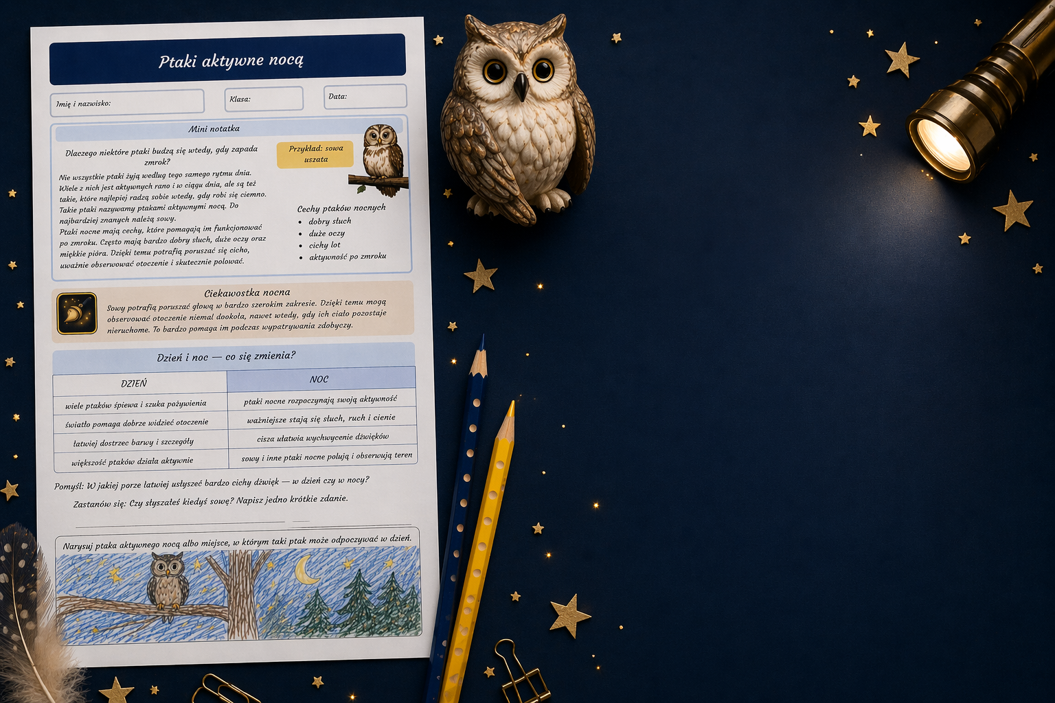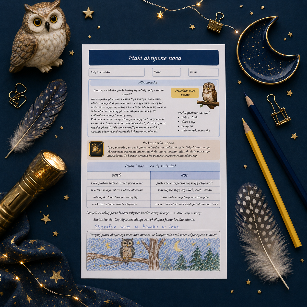 To estetyczna i przemyślana karta pracy dla uczniów, która wprowadza temat ptaków aktywnych po zmroku w sposób prosty, ciekawy i angażujący. Materiał łączy krótką teorię z zadaniami sprawdzającymi wiedzę oraz elementami rozwijającymi myślenie.
