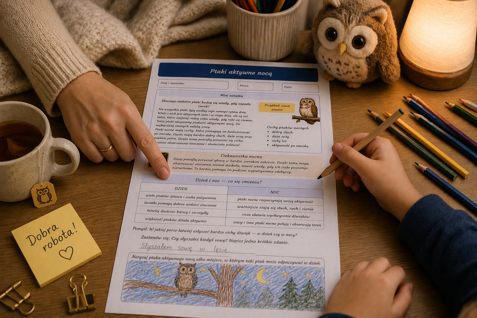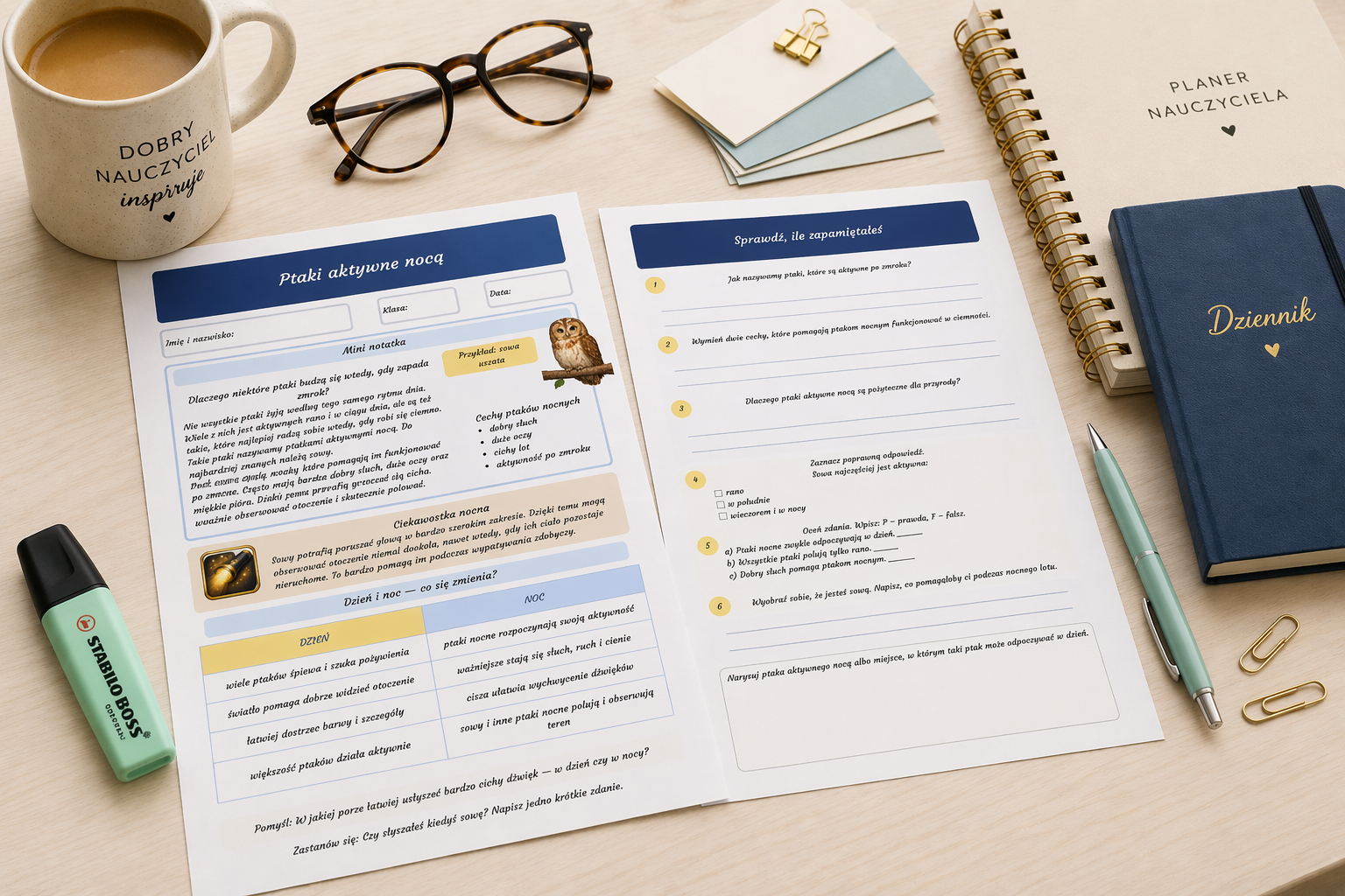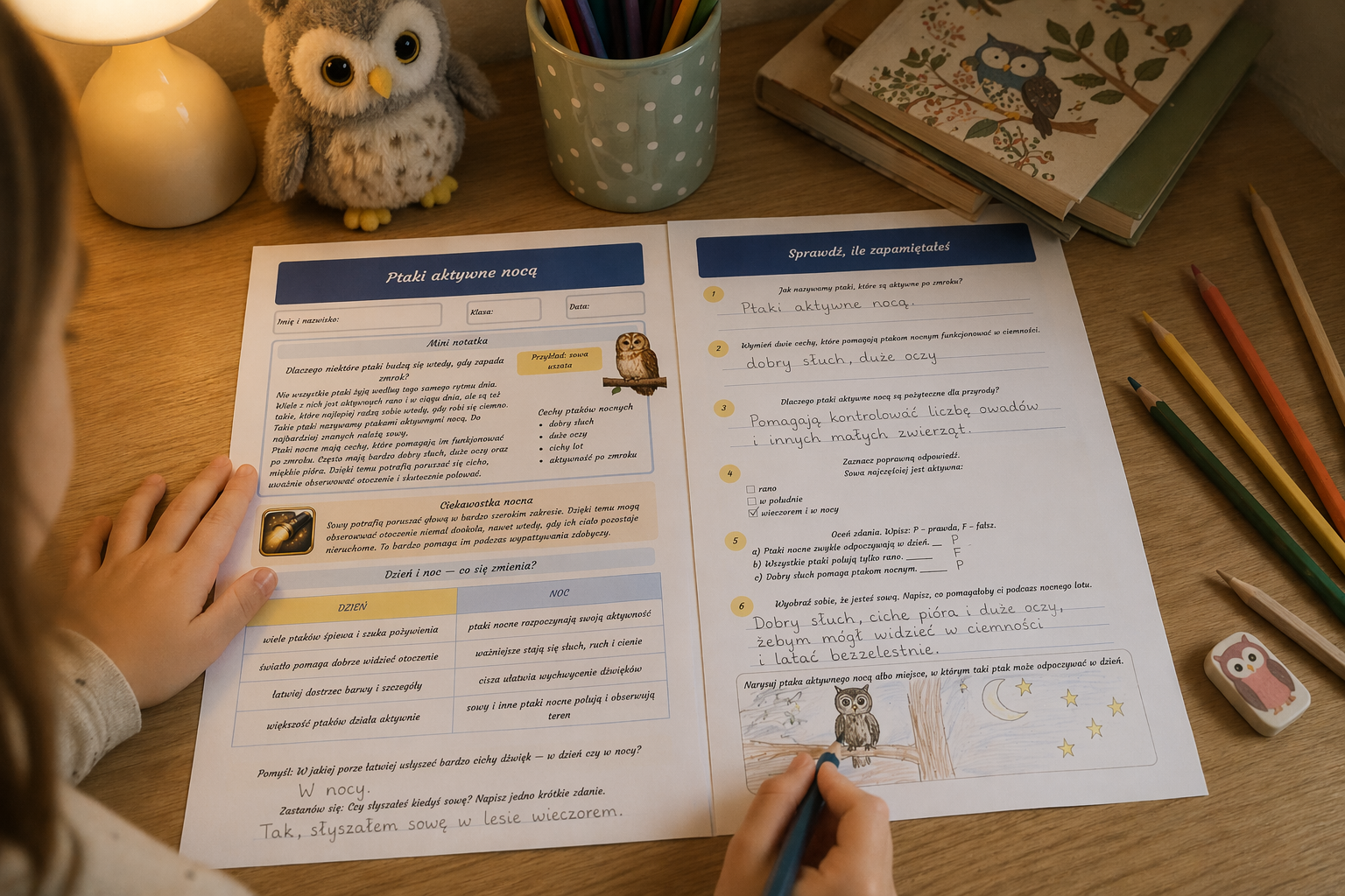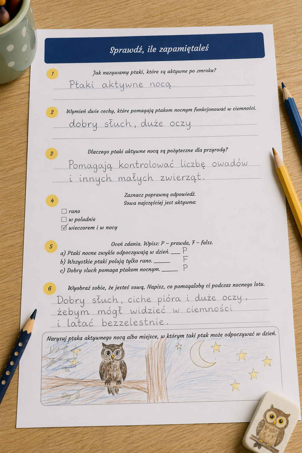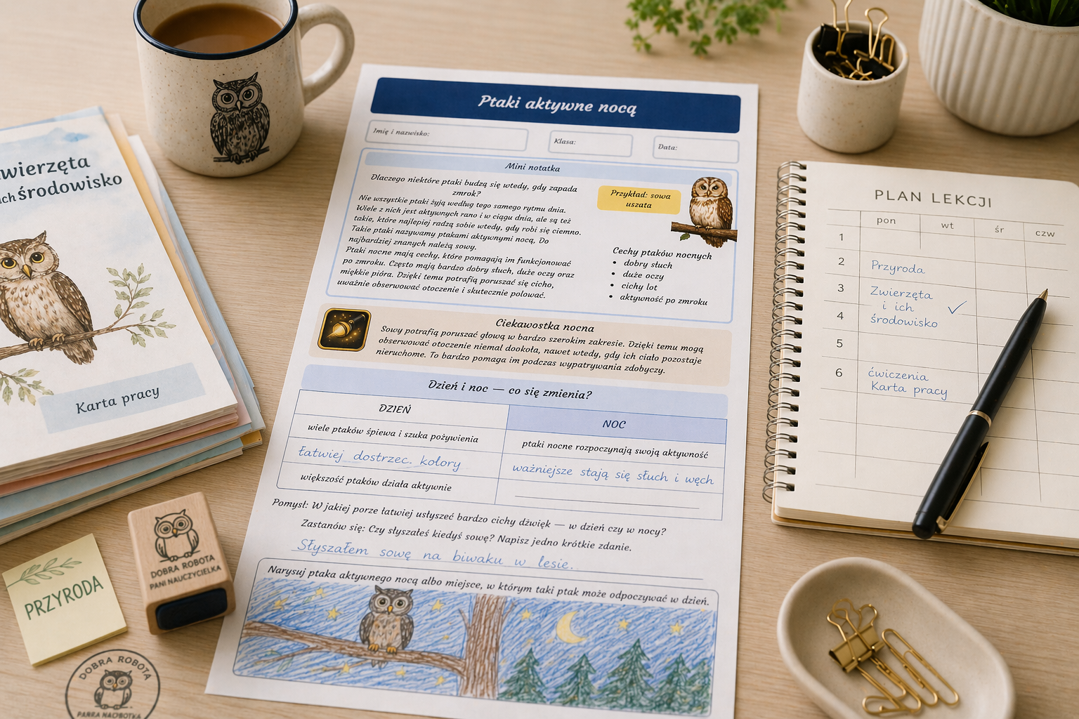 To estetyczna i przemyślana karta pracy dla uczniów, która wprowadza temat ptaków aktywnych po zmroku w sposób prosty, ciekawy i angażujący. Materiał łączy krótką teorię z zadaniami sprawdzającymi wiedzę oraz elementami rozwijającymi myślenie.