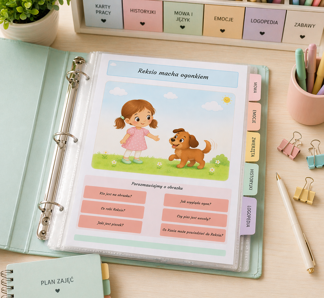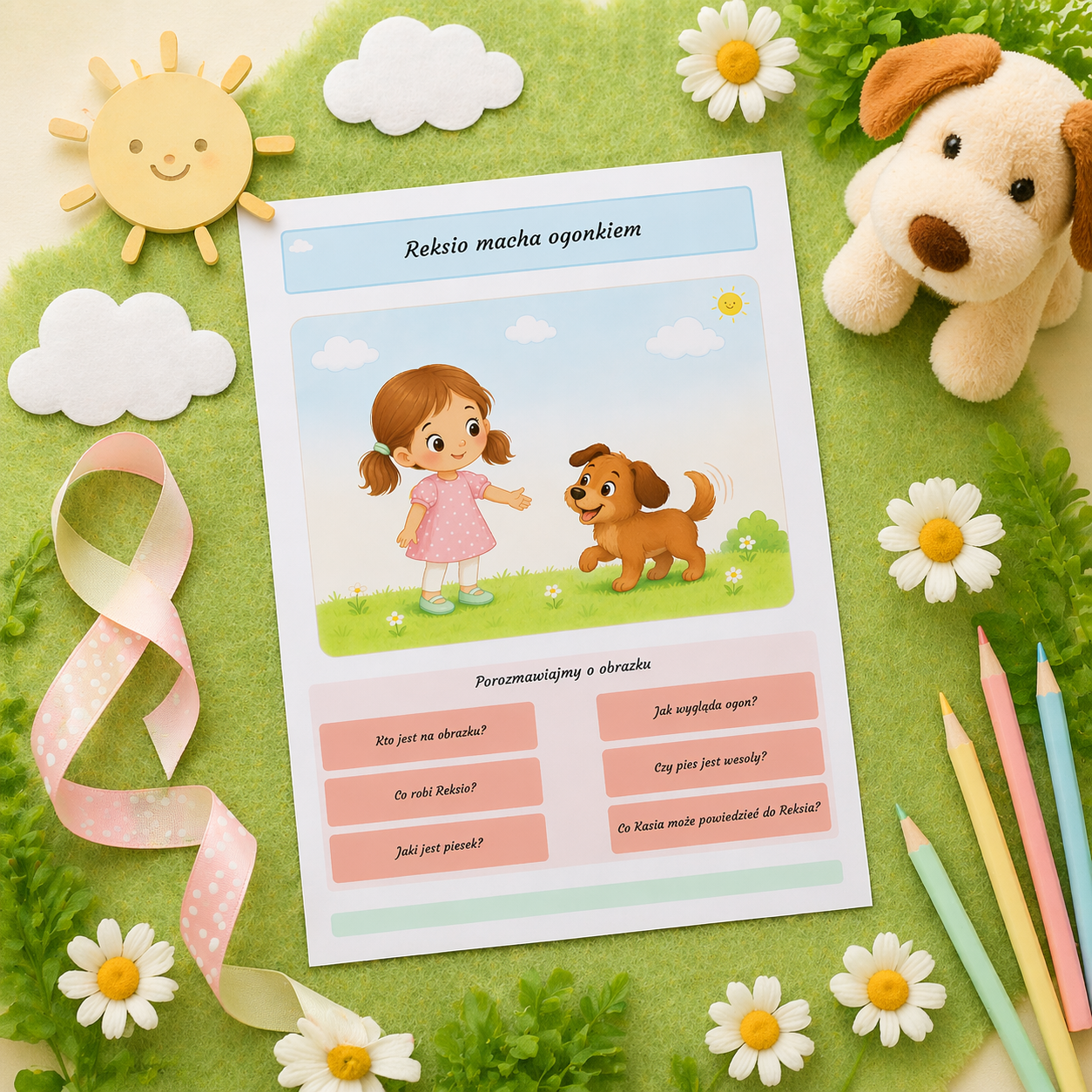 Stworzyłam materiał „Reksio macha ogonkiem” jako przyjazną i angażującą pomoc do rozmów z dziećmi 🐶💛. Już na pierwszy rzut oka zadbałam o spokojną, pastelową kolorystykę i czytelny układ, żeby dzieci mogły skupić się na tym, co najważniejsze – obserwacji i mówieniu. Na ilustracji umieściłam dziewczynkę i radosnego pieska na łące, w słoneczny dzień ☀️🌼. Chciałam, aby scena była bliska dzieciom, ciepła i zachęcająca do opowiadania.