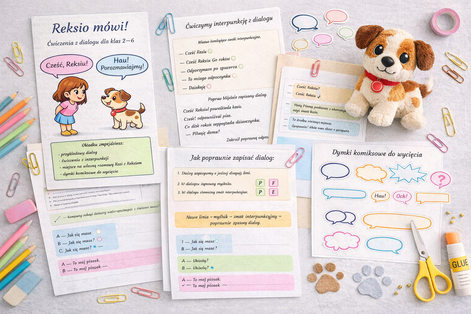 👉 „Reksio mówi!” to kolorowy materiał edukacyjny w wersji cyfrowej (PDF), który krok po kroku wprowadza uczniów w świat dialogu – w prosty, zrozumiały i angażujący sposób.