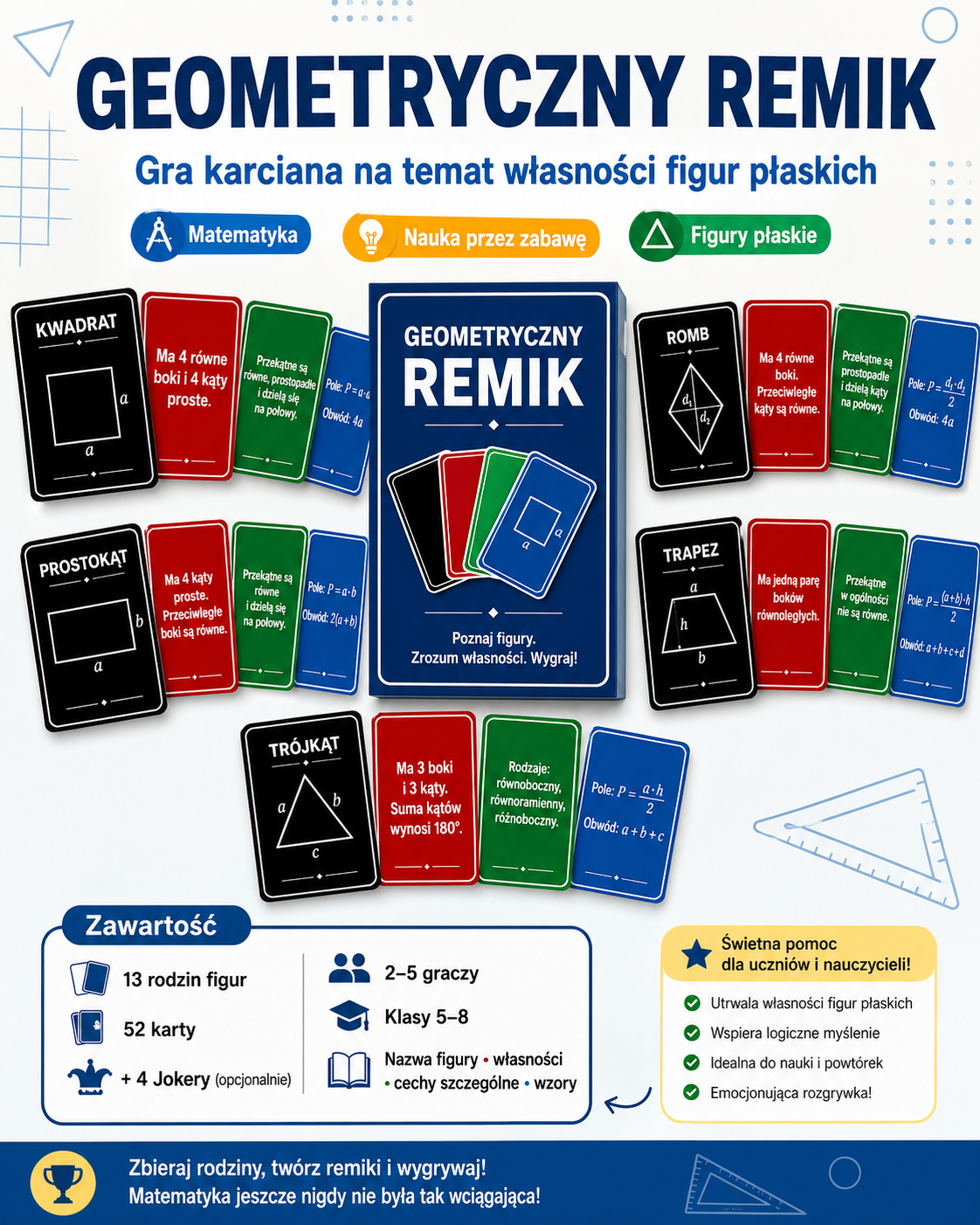 Geometryczny Remik to edukacyjna gra karciana inspirowana zasadami klasycznego remika. Jej celem jest utrwalenie własności figur płaskich w ciekawy, angażujący i praktyczny sposób.