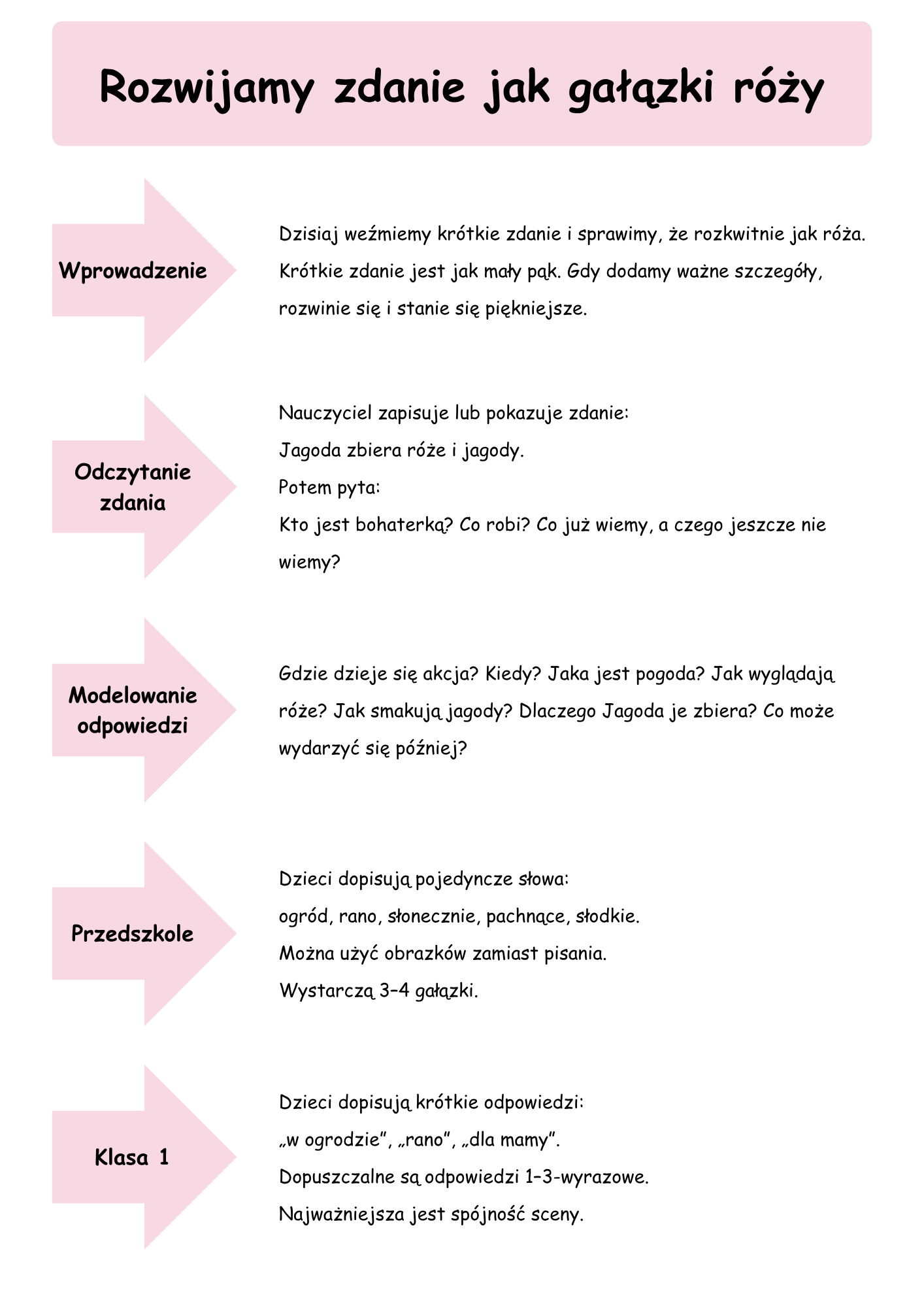 Jeśli szukasz materiału, który nie jest suchy, schematyczny i przewidywalny, tylko porusza wyobraźnię, zachęca do mówienia, pisania, obserwowania, działania i tworzenia — ten pakiet został stworzony właśnie po to. Dzieci zaczynają od prostego zdania, a potem krok po kroku rozbudowują je jak gałązki róży. Uczą się, jak z krótkiej myśli stworzyć rozbudowaną wypowiedź, opis, a nawet całe opowiadanie. To nauka, która dzieje się naturalnie, lekko i z przyjemnością.