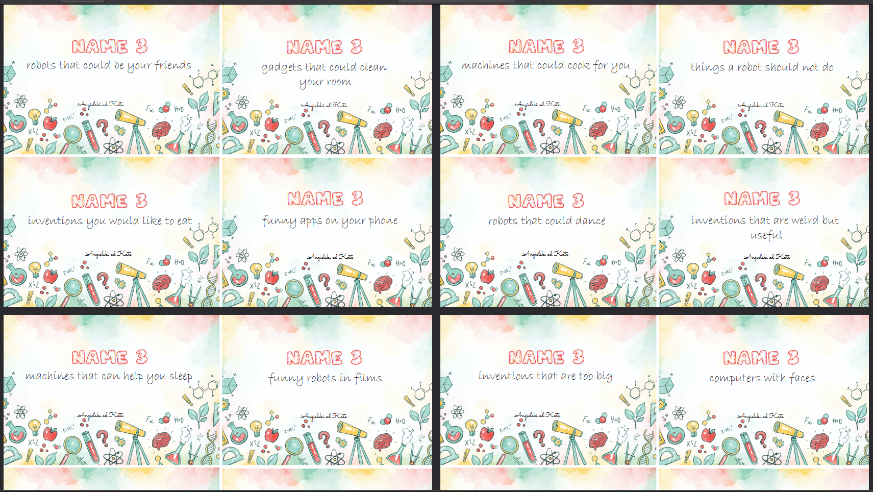 Science (Nauka i technika) gra Name 3 /40 kart zawiera 56 kart do ćwiczenia mówienia na lekcji języka angielkiego w miły i zabawny sposób o tematyce nauki i techniki. Zawiera również tło. Zagadnienia od A1- B2. Zapraszam!