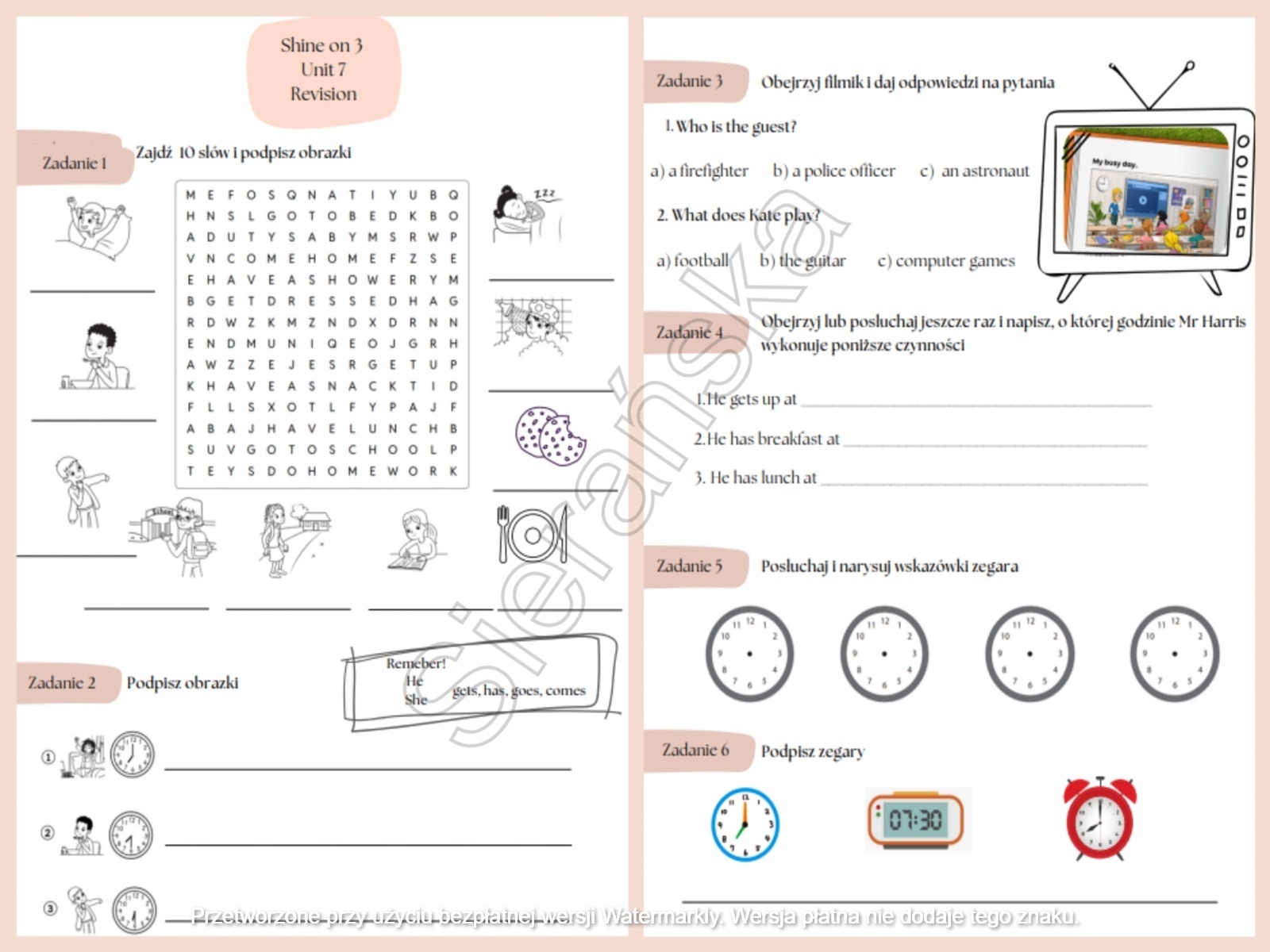 Zestaw ćwiczeń stworzony z myślą o uczniach, którzy przerabiają materiał z rozdziału 7 z podręcznika Shine on! dla 3 klasy. Idealnie pasuje do powtórzenia całego materiału: