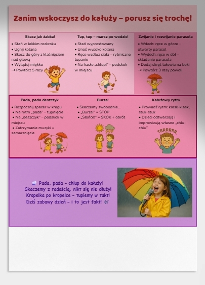 Przygotuj się na radosne chlupanie i superskoki! 💦 „Skaczące Kałuże” to gotowy, cyfrowy materiał edukacyjny pełen ruchu, śmiechu i kolorów! 🎨👧🧒 Idealny do wykorzystania w przedszkolu, klasach 1–3, świetlicy, a także podczas zajęć integracyjnych.