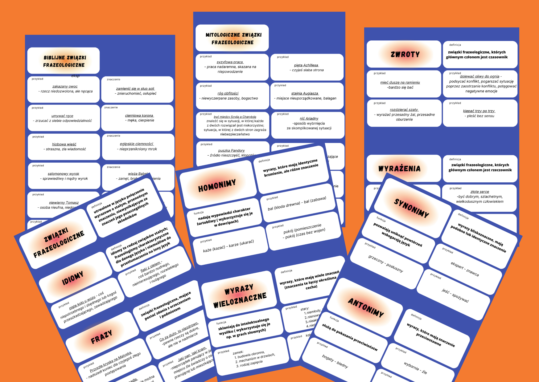 Materiał zawiera 6 stron z fiszkami ( 74 fiszki), które dotyczą słownictwa: synonimy, antonimy, homonimy, wyrazy wieloznaczne, frazeologizmy. Na fiszkach znajdują się: terminy, definicje, przykłady.