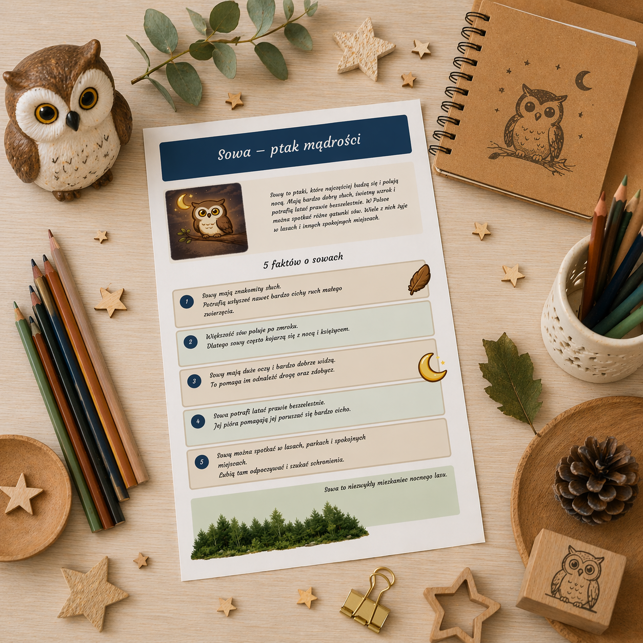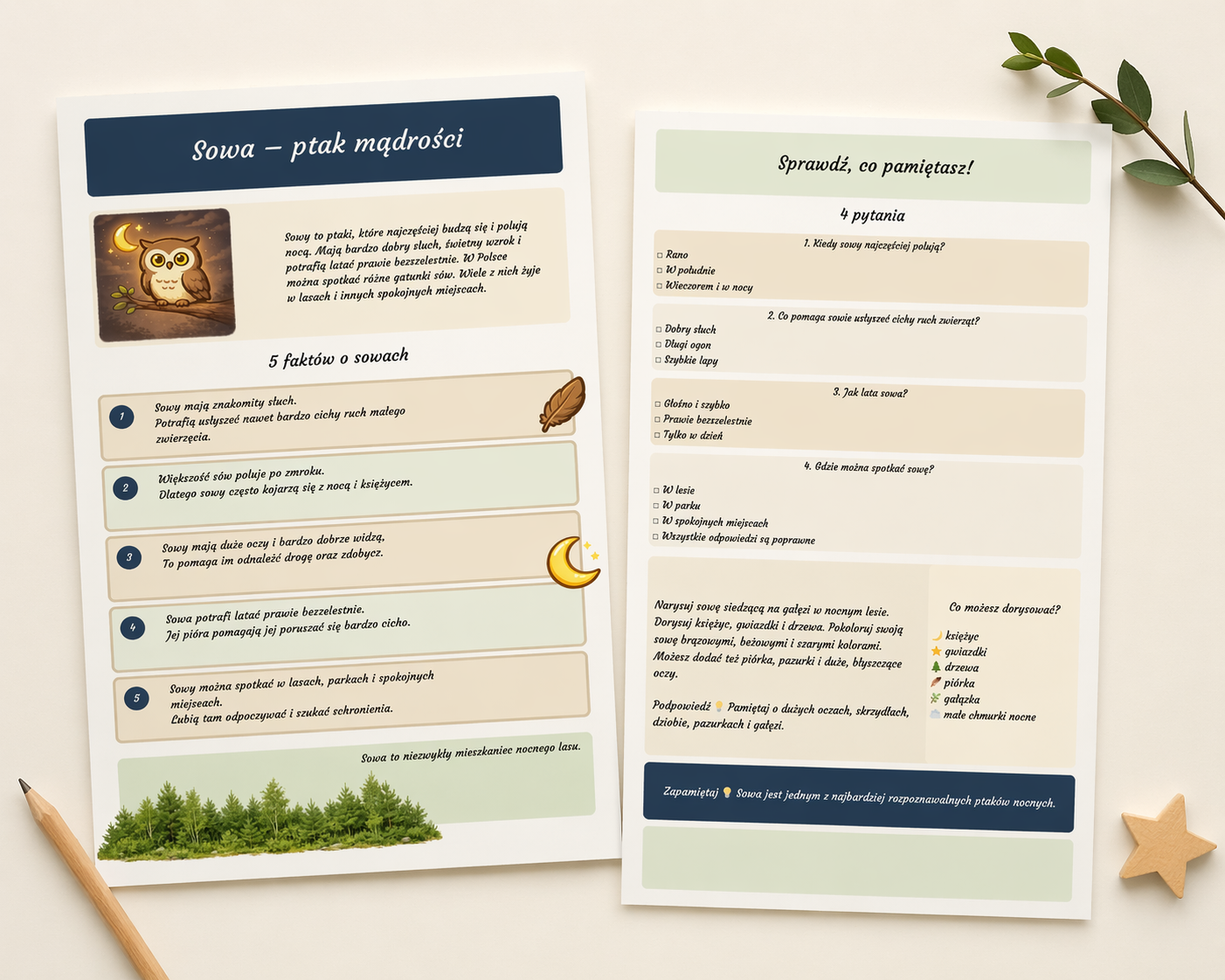 Znajdziesz w niej krótki opis sowy, 5 ważnych faktów, pytania sprawdzające, a także zadanie plastyczne, które rozwija wyobraźnię i zachęca do twórczej pracy 🎨🌲