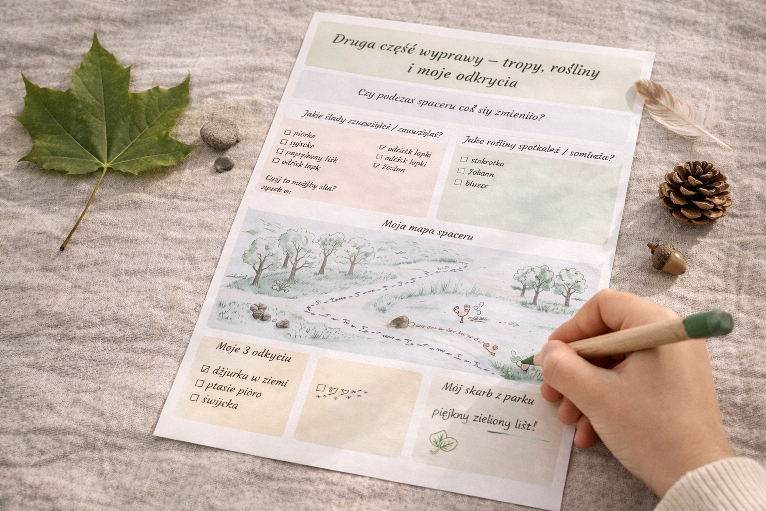 To nie jest zwykła karta do odhaczania. To zaproszenie do patrzenia, słuchania, wąchania, porównywania, rysowania i opowiadania o świecie. Dziecko obserwuje pogodę, dźwięki, zapachy, ptaki, liście, ślady w terenie, rośliny i własne odkrycia, a przy okazji ćwiczy koncentrację, spostrzegawczość i uważność. 🍃👀🗺️