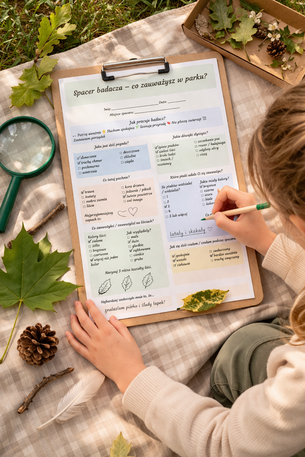 „Spacer badacza – co zauważysz w parku?” to pięknie przygotowana karta pracy PDF, dzięki której dziecko staje się małym odkrywcą przyrody!