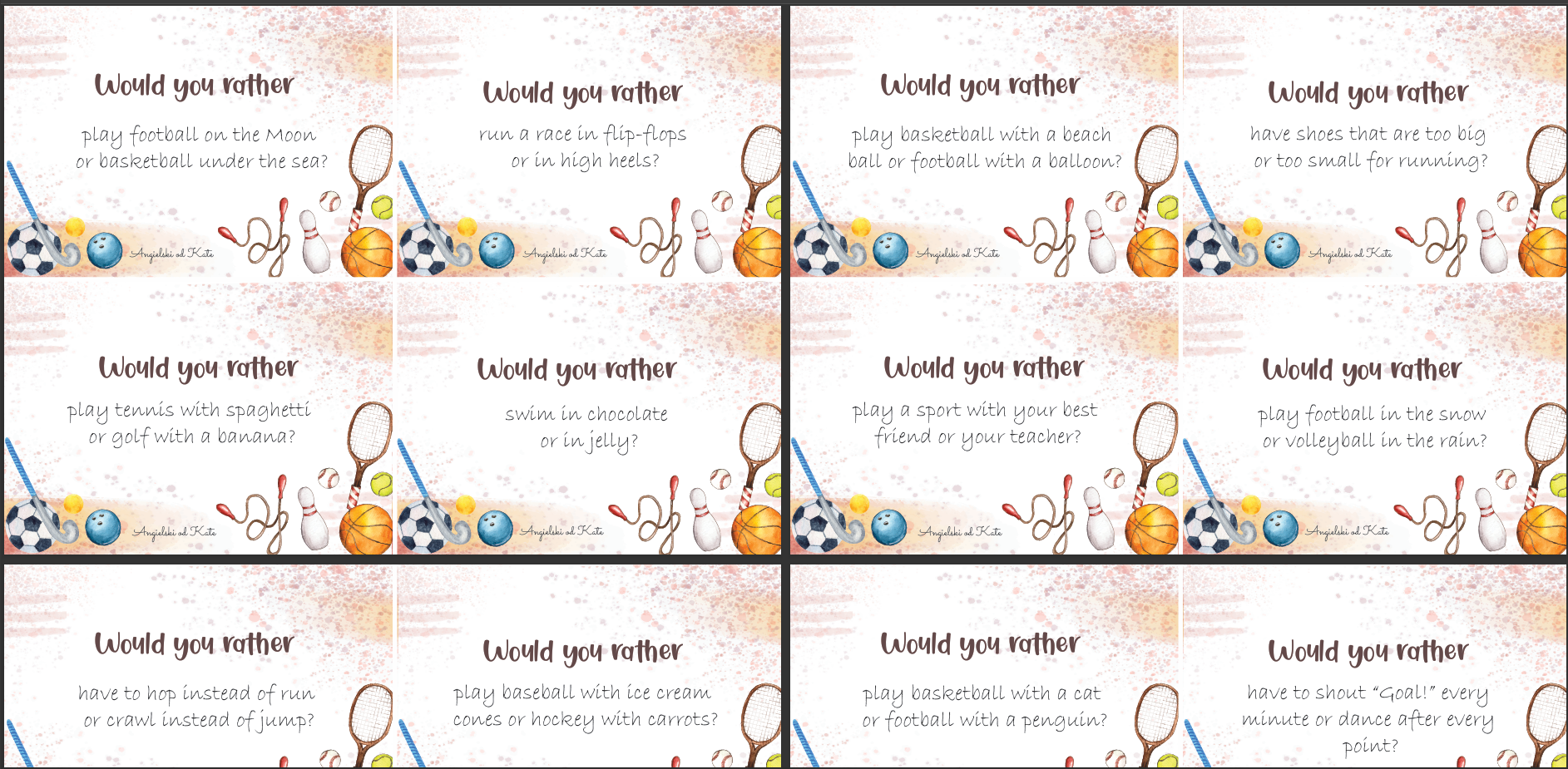 Sport gra Would you rather /48 kart to zestaw 48 zabawnych pytań ćwiczacych mówienie na zajęciach z języka angielskiego o tematyce Sportu. Zawiera również tło. Zagadnienia od A1- B2. Zapraszam!