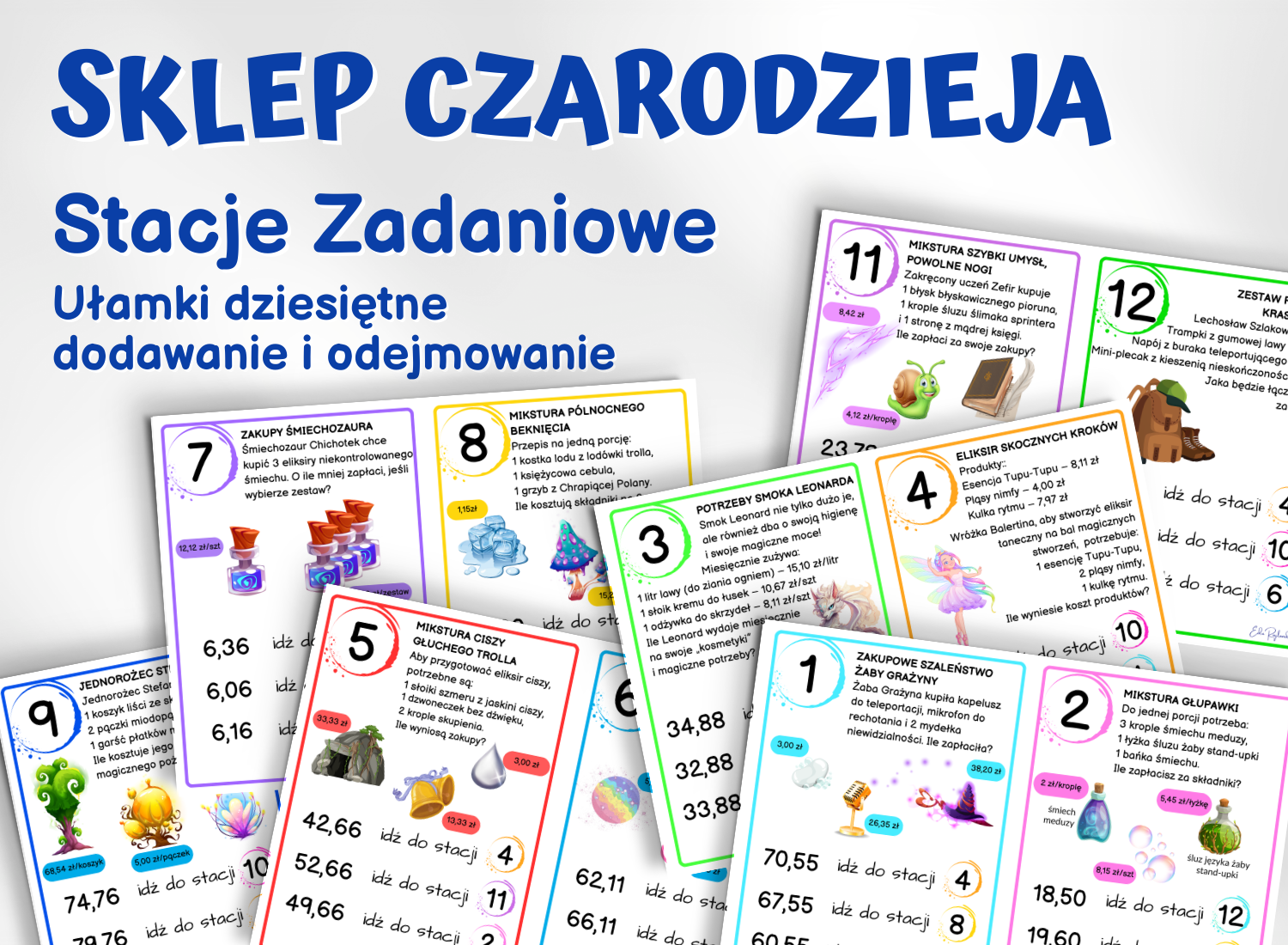 Zanurz swoich uczniów w pełen humoru, czarów i matematyki świat niezwykłych zakupów! Ten zestaw stacji zadaniowych przenosi klasę prosto do magicznego targu, gdzie półki uginają się od eliksirów i magicznych produktów.