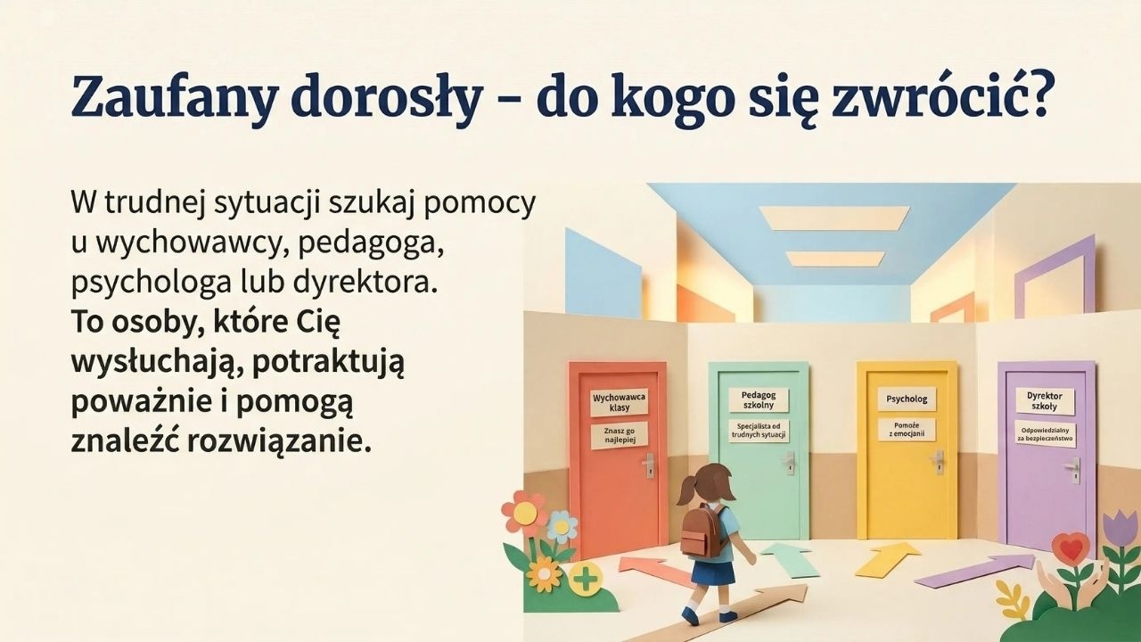 Jak pracować z materiałem? Najprościej wydrukować plansze w A4 lub A3 i umieścić je w widocznych miejscach (korytarz, świetlica, biblioteka, gabinet pedagoga/psychologa). Jako prezentację na godzinie wychowawczej warto omówić materiał modułowo: najpierw „Twoje prawa i prywatność”, potem „rodzaje przemocy i zaniedbanie”, a na końcu „gdzie szukać pomocy”. Dobrze działa też krótka aktywność: uczniowie wskazują 2 osoby w szkole, do których mogą się zwrócić, oraz 1 zasadę dotyczącą wizerunku/danych, którą zapamiętali.