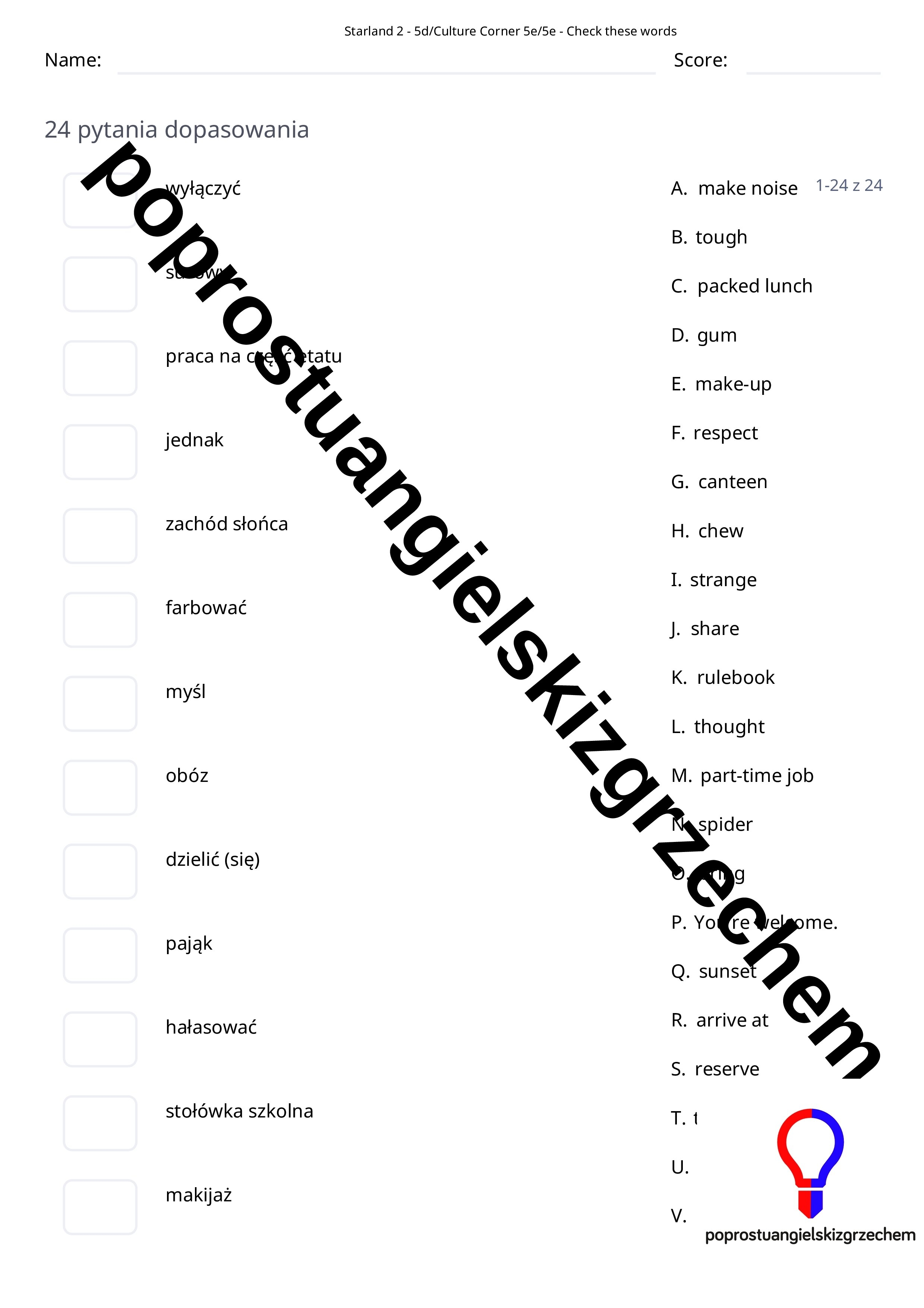 Zestaw zawiera 109 słówek z działu piątego do podręcznika Starland 2. Testy podzielone są na 5 podrozdziałów, a każdy z nich na 4 kategorie zadań (prawda/fałsz, dopasuj, wielokrotny wybór, pisemny)