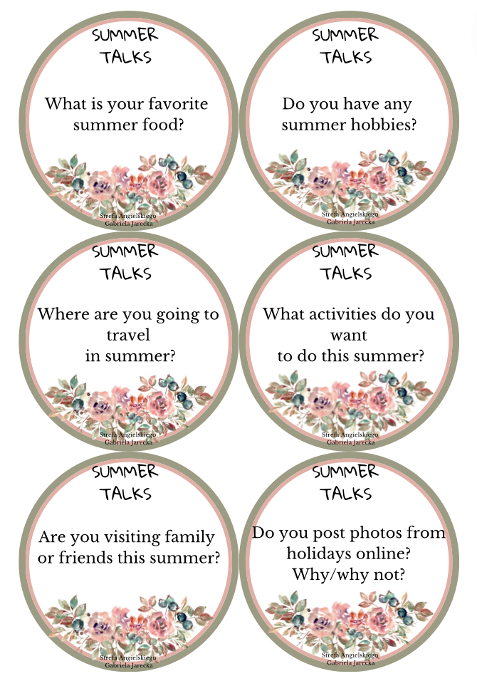 30 kart do samodzielnego wydrukowania i zalaminowania, lub wyświetlenia podczas lekcji online. Pytania dotyczące tematyki summer.