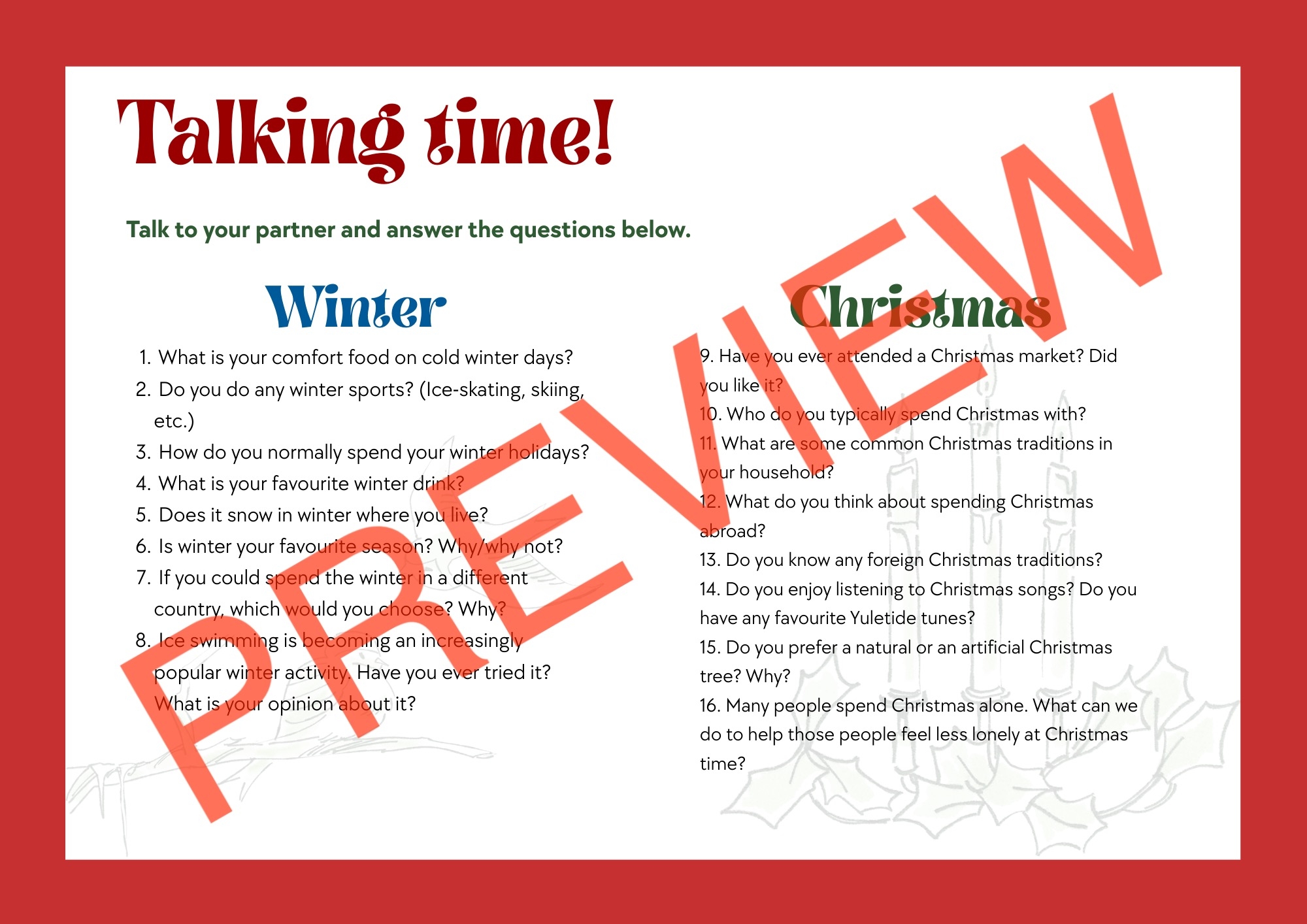 Święta tuż za rogiem, a Ty dalej nie masz pomysłu na świąteczną lekcję? Don't worry, I've got you covered 😉 Karta pracy idealna na lekcje świąteczne lub zimowe zajęcia języka angielskiego na poziomie średnio zaawansowanym (B1/B1+). Materiał łączy rozwijanie rozumienia ze słuchu, utrwalanie gramatyki oraz mówienie, dzięki czemu sprawdzi się zarówno na lekcji stacjonarnej, jak i online.