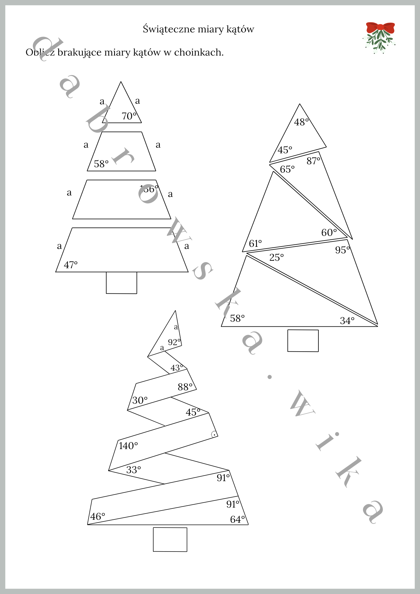 Materiał zawiera świąteczną kartę pracy dotyczącą miar kątów.
