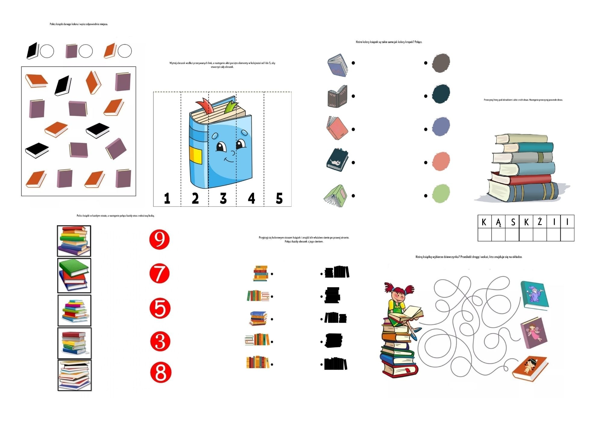 • Zabawy językowe: Rozsypanki literowe (układanie słowa KSIĄŻKI) oraz śledzenie dróg liter.