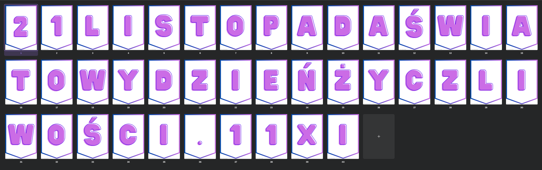 Poszczególne litery i cyfry na osobnych kartkach. Opcje, które można stworzyć: 21.11 ŚWIATOWY DZIEŃ ŻYCZLIWOŚCI 21.XI ŚWIATOWY DZIEŃ ŻYCZLIWOŚCI 21. LISTOPADA ŚWIATOWY DZIEŃ ŻYCZLIWOŚCI