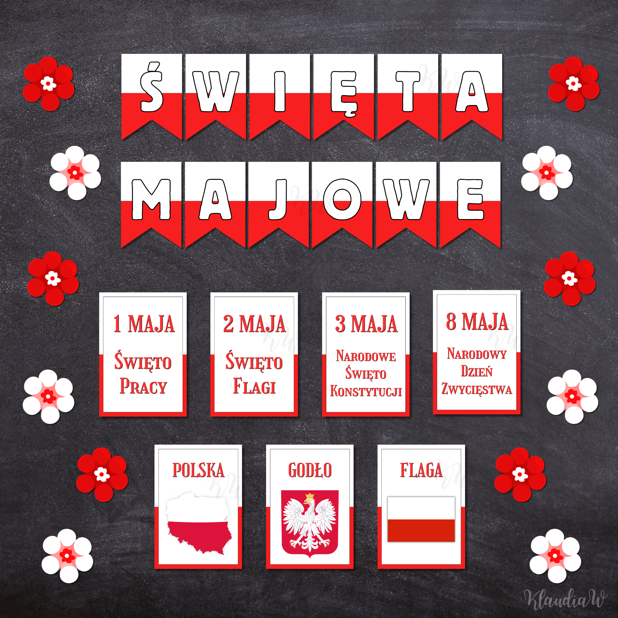 • plansze: 1 maja - Święto Pracy, 2 maja - Święto Flagi, 3 maja - Narodowe Święto Konstytucji, 8 maja - Narodowy Dzień Zwycięstwa, mapa Polski, godło Polski i flaga Polski,
