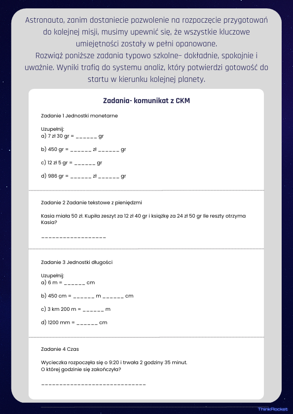 Zadania rozwijają umiejętność pracy z czasem, długościami i zadaniami tekstowymi.